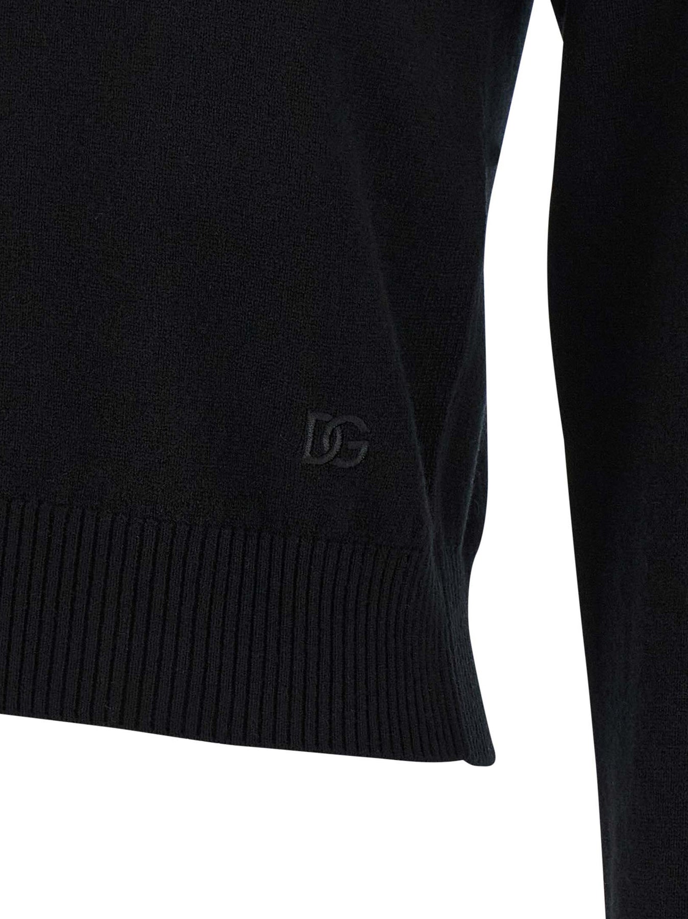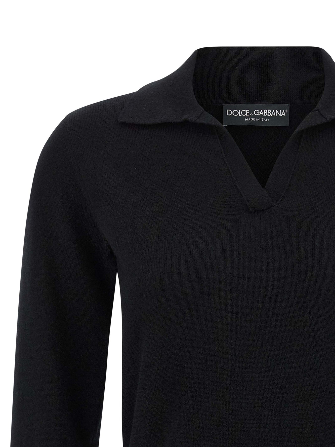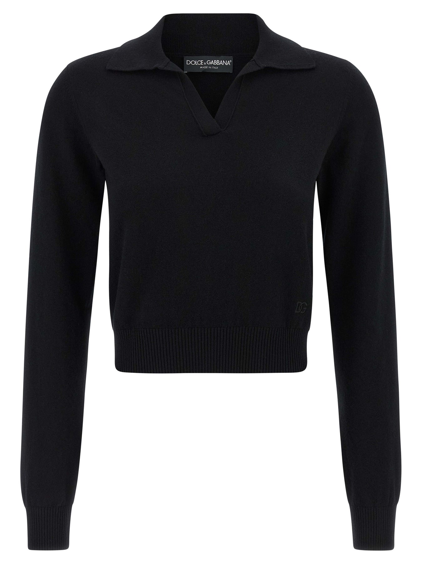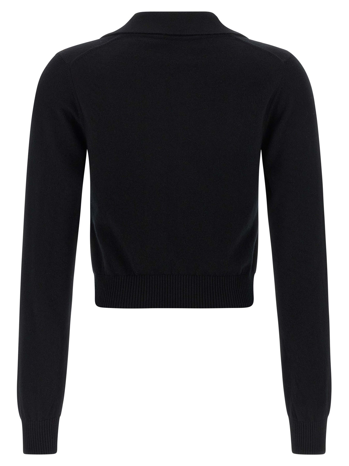 Polo-style cashmere sweater with collar and V-neck, tone-on-tone logo embroidery on the front, long sleeves with cuffs and slightly reduced shoulders.