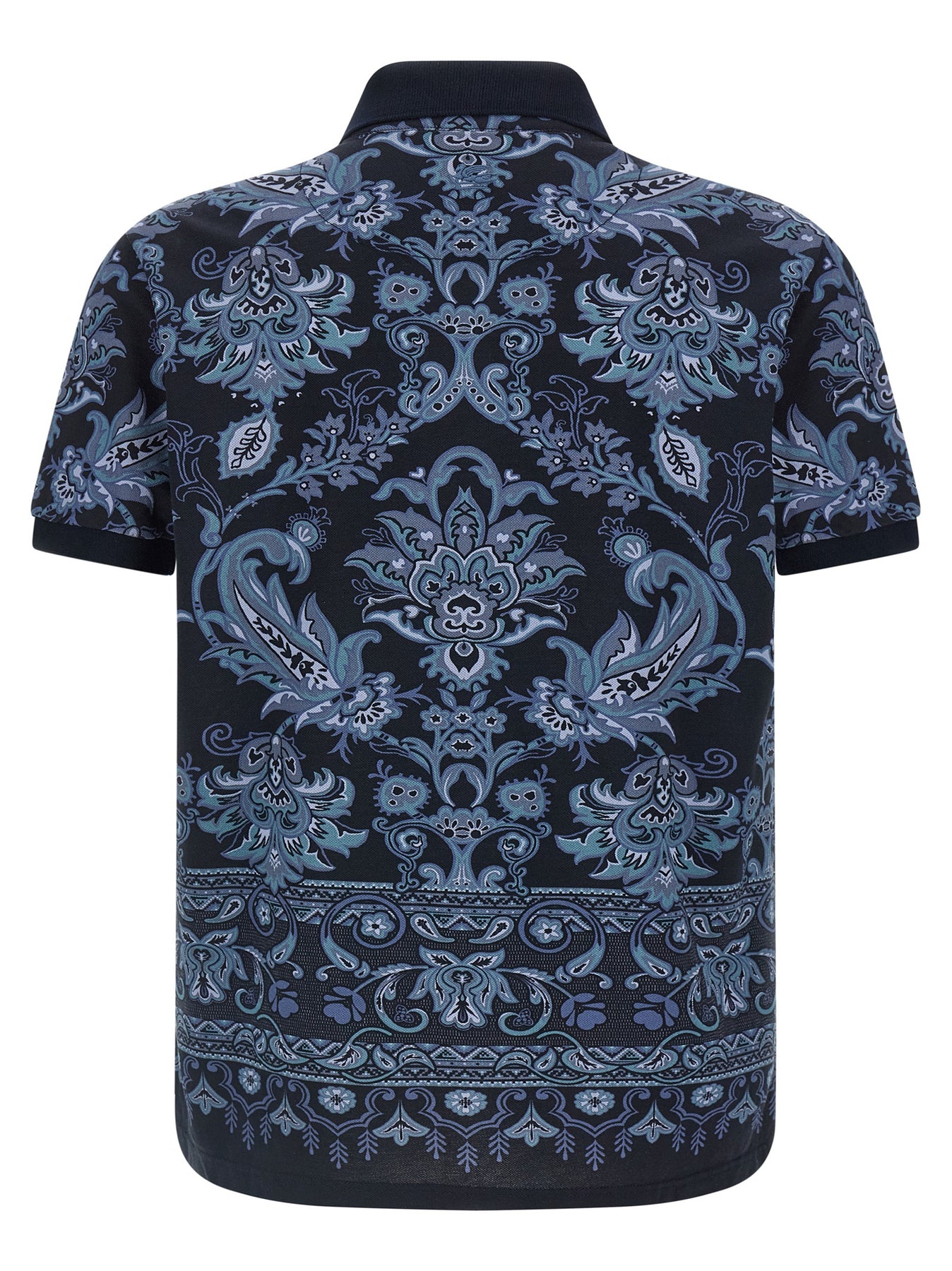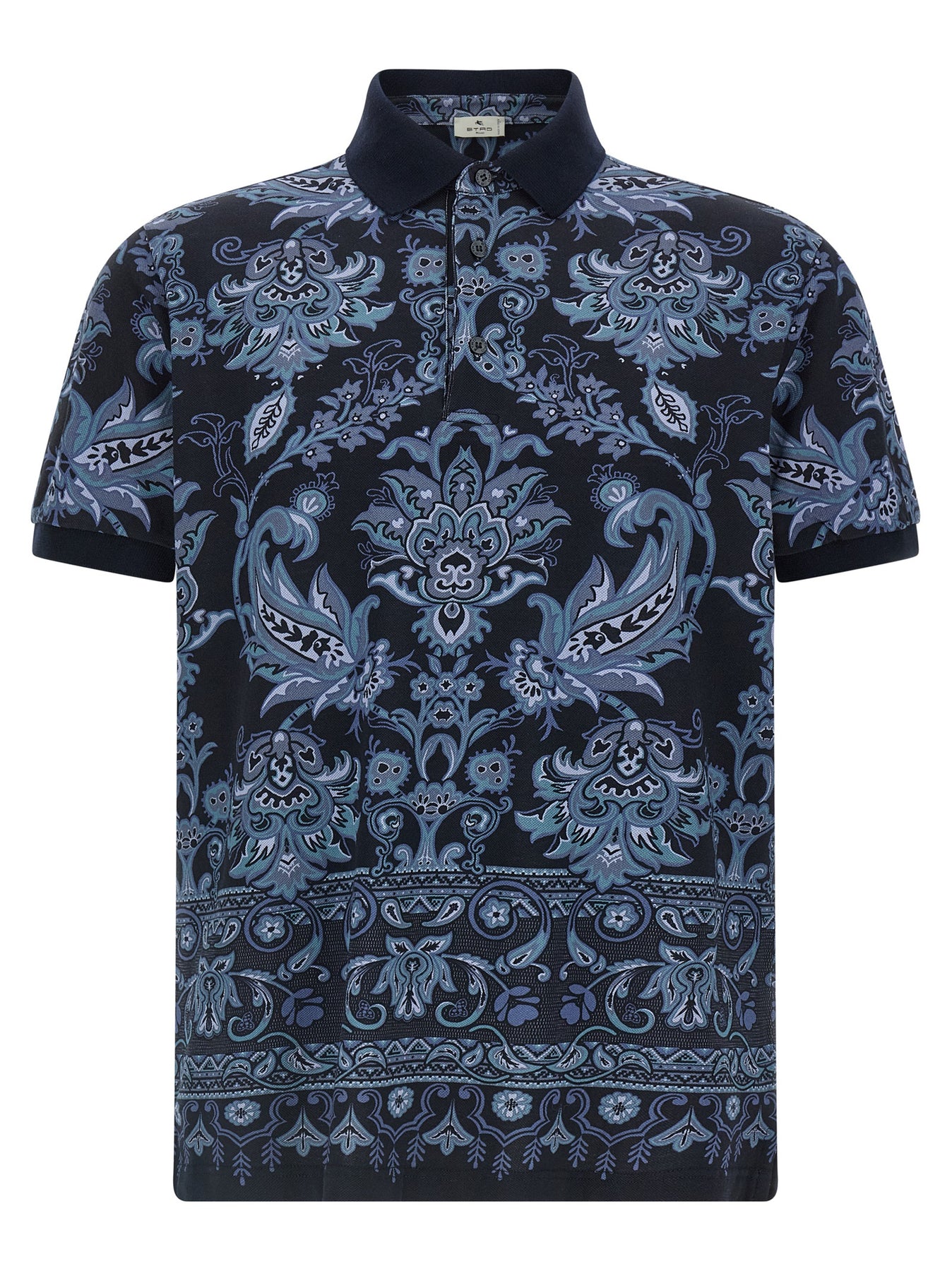 Cotton piqué polo shirt with all-over floral and geometric patterns, collar and buttons, short sleeves, side slits.