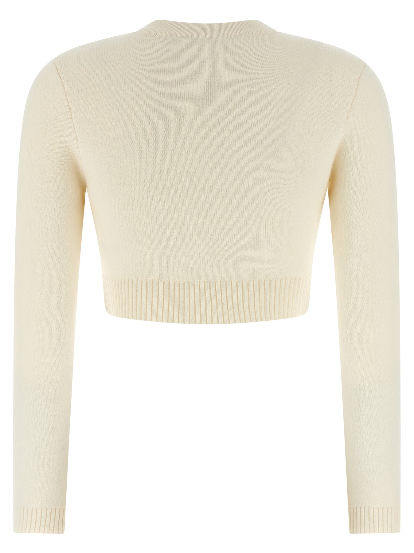 'Cream Wool' wool cardigan, crop model, front hidden snap button closure with overlapping jewel buttons, crew neck, long sleeves.