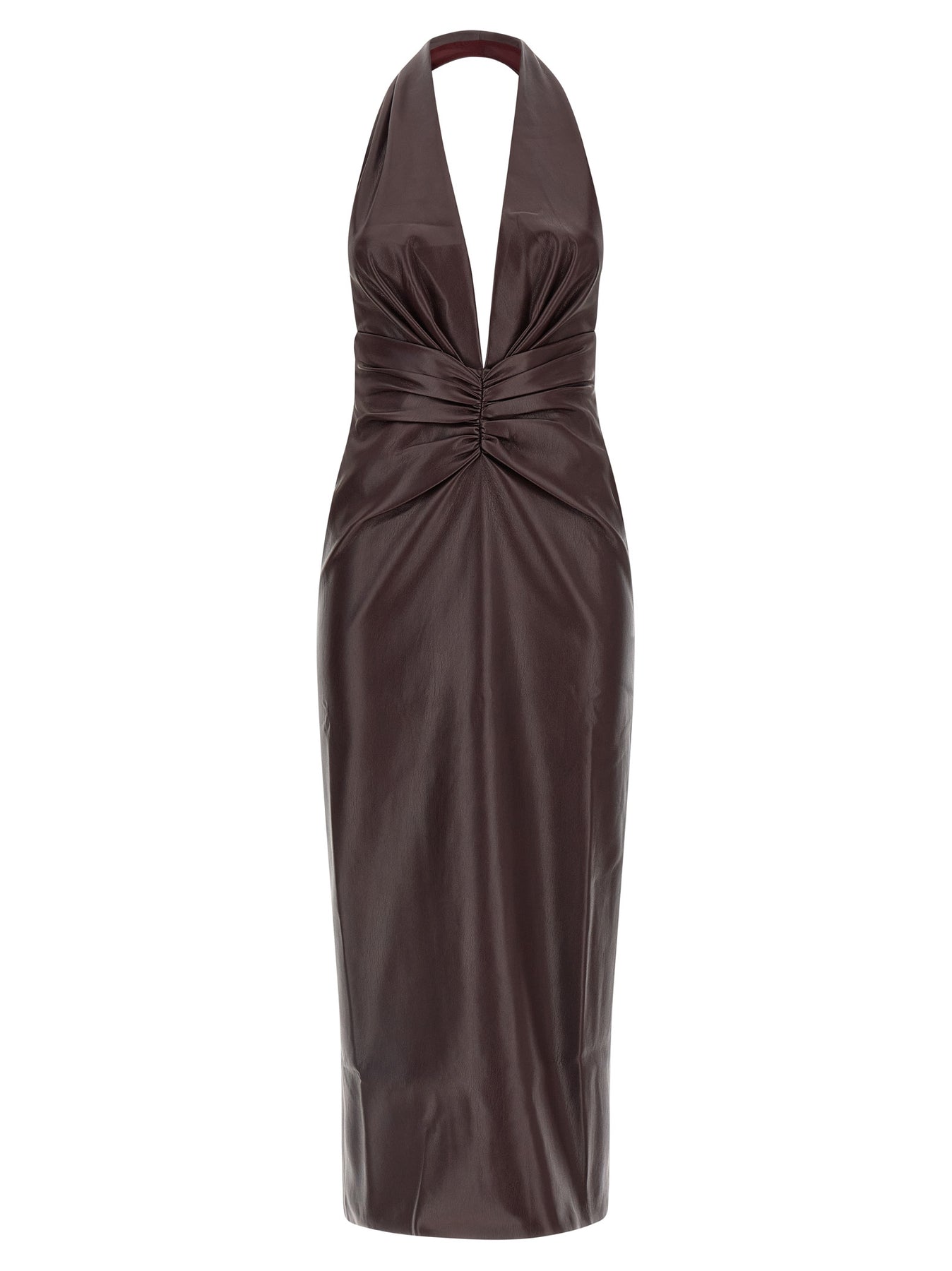 'Zendaya' nappa effect fabric midi dress with deep front V-neck with loop behind the neck, open back, front and back curl, zip closure and back split, lining.