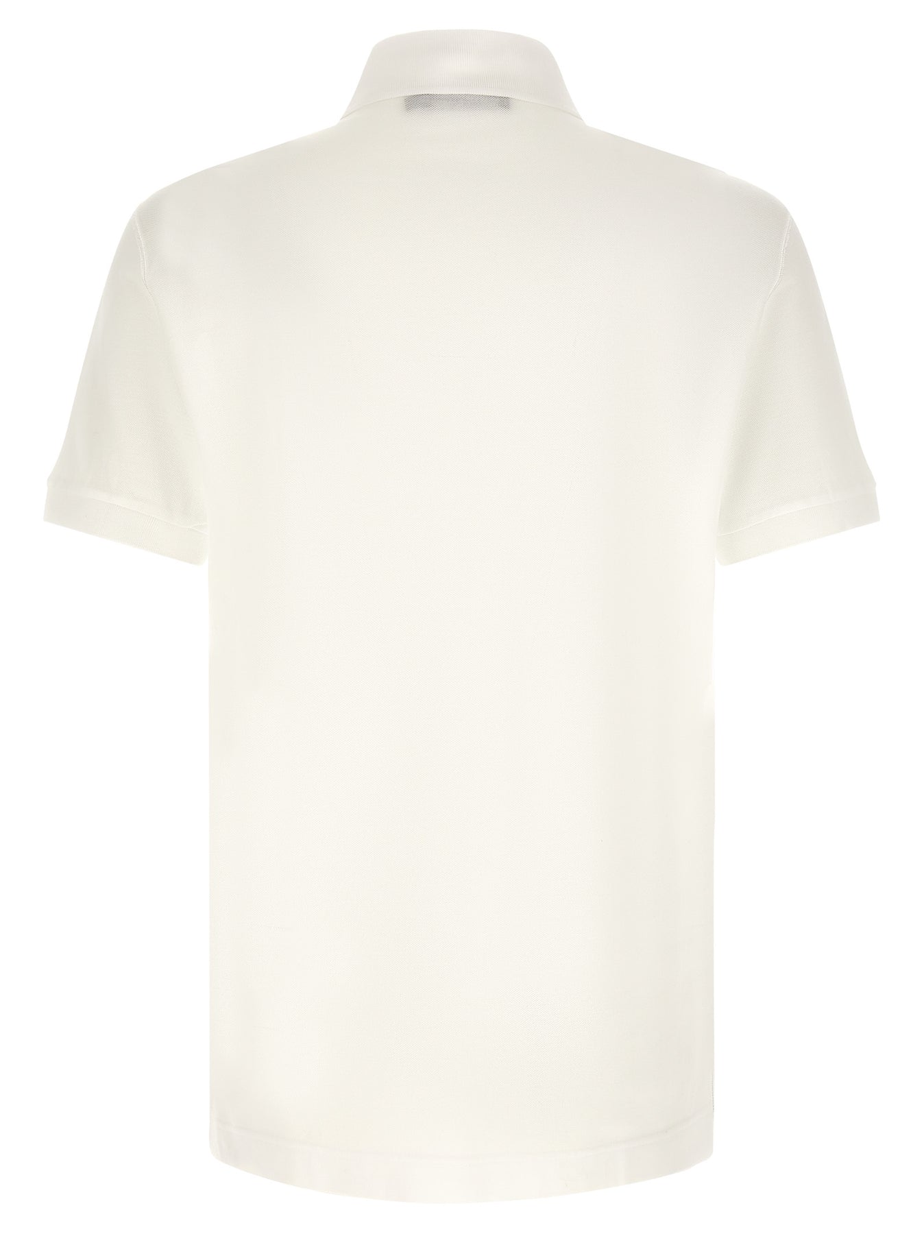 Piqué cotton polo shirt, leather patch with front metal logo tag, collar and buttons, short cuffed sleeves, side vents.