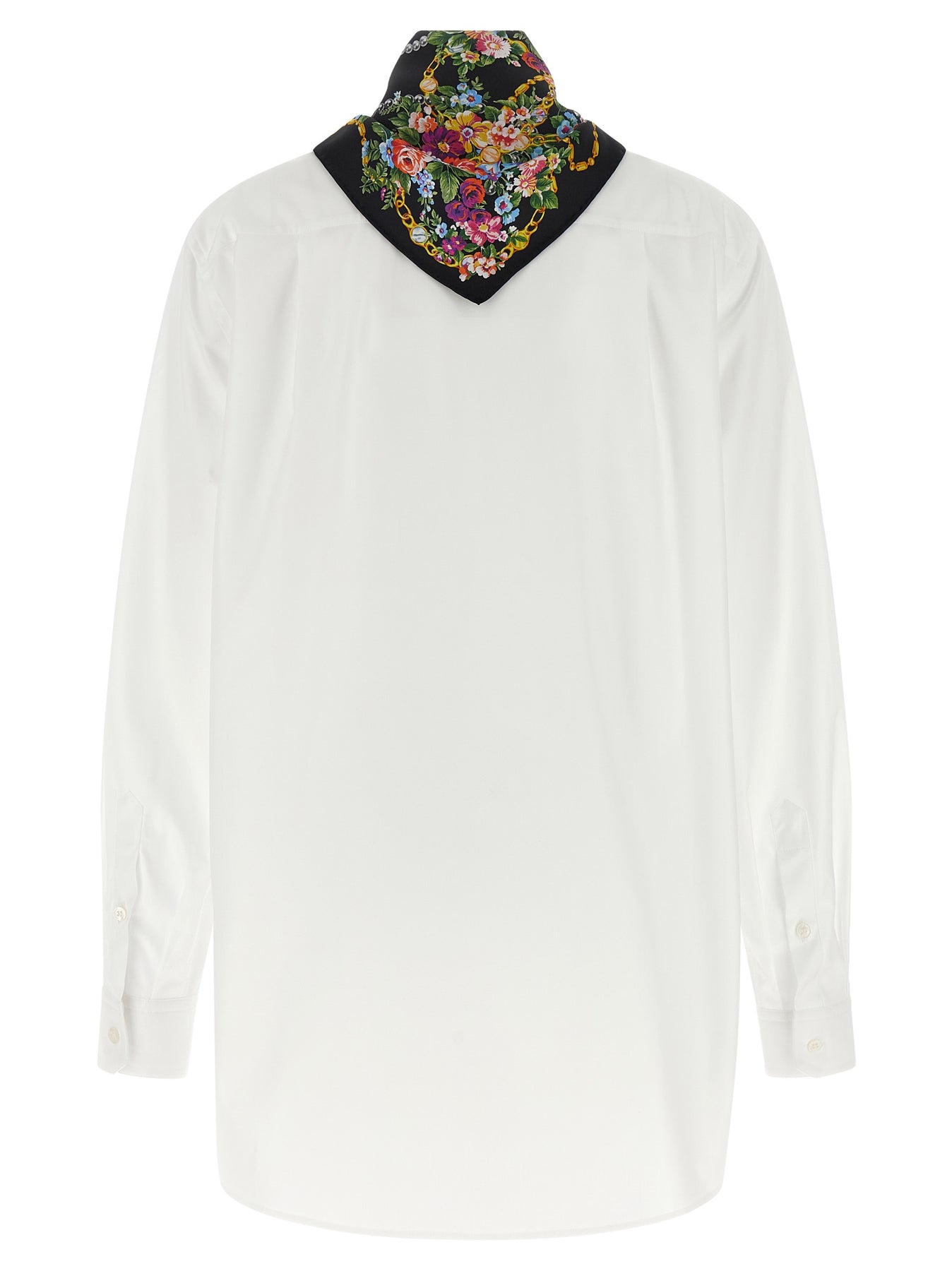 Cotton poplin shirt, mandarin collar, front mother-of-pearl button closure, long cuffed sleeves, patterned triangle silk scarf fixed on the neckline with buttons and removable.