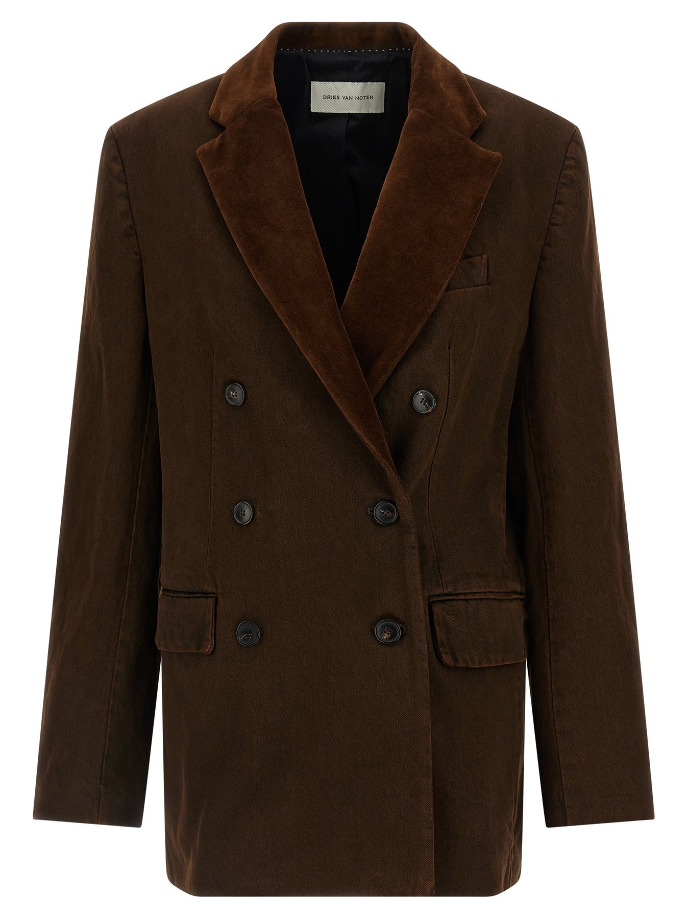 'Befya' double-breasted stonewashed cotton denim blazer with front button closure, tone-on-tone velvet lapel collar, breast pocket, flap pockets, structured shoulder strap, long sleeves, back vents, cotton lining.