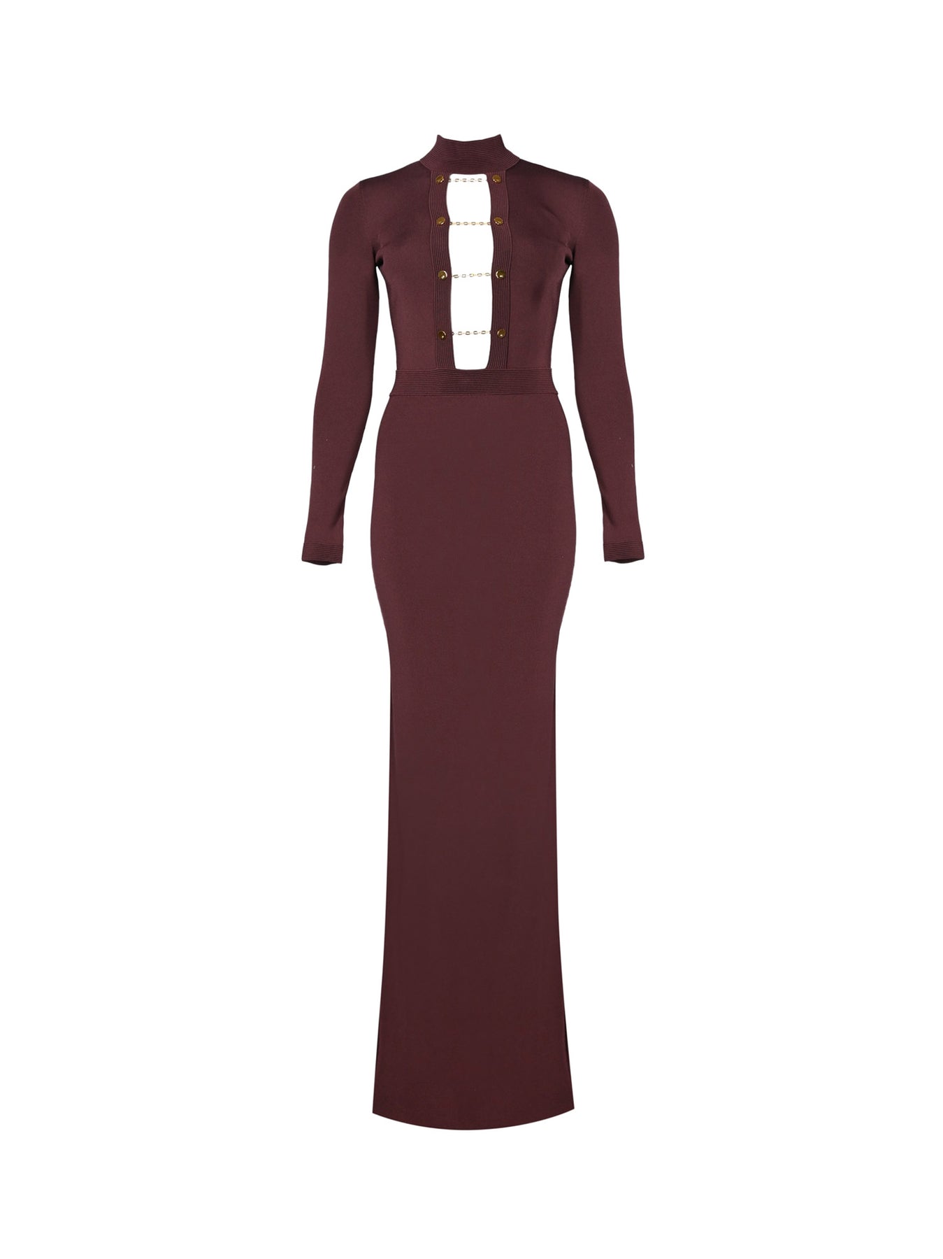 Side zip closure Front cut-out detail with logo buttons Plunge neckline Long sleeves 65% viscose, 32% polyamide, 3% elastane SKU: AM29S57E2EA4