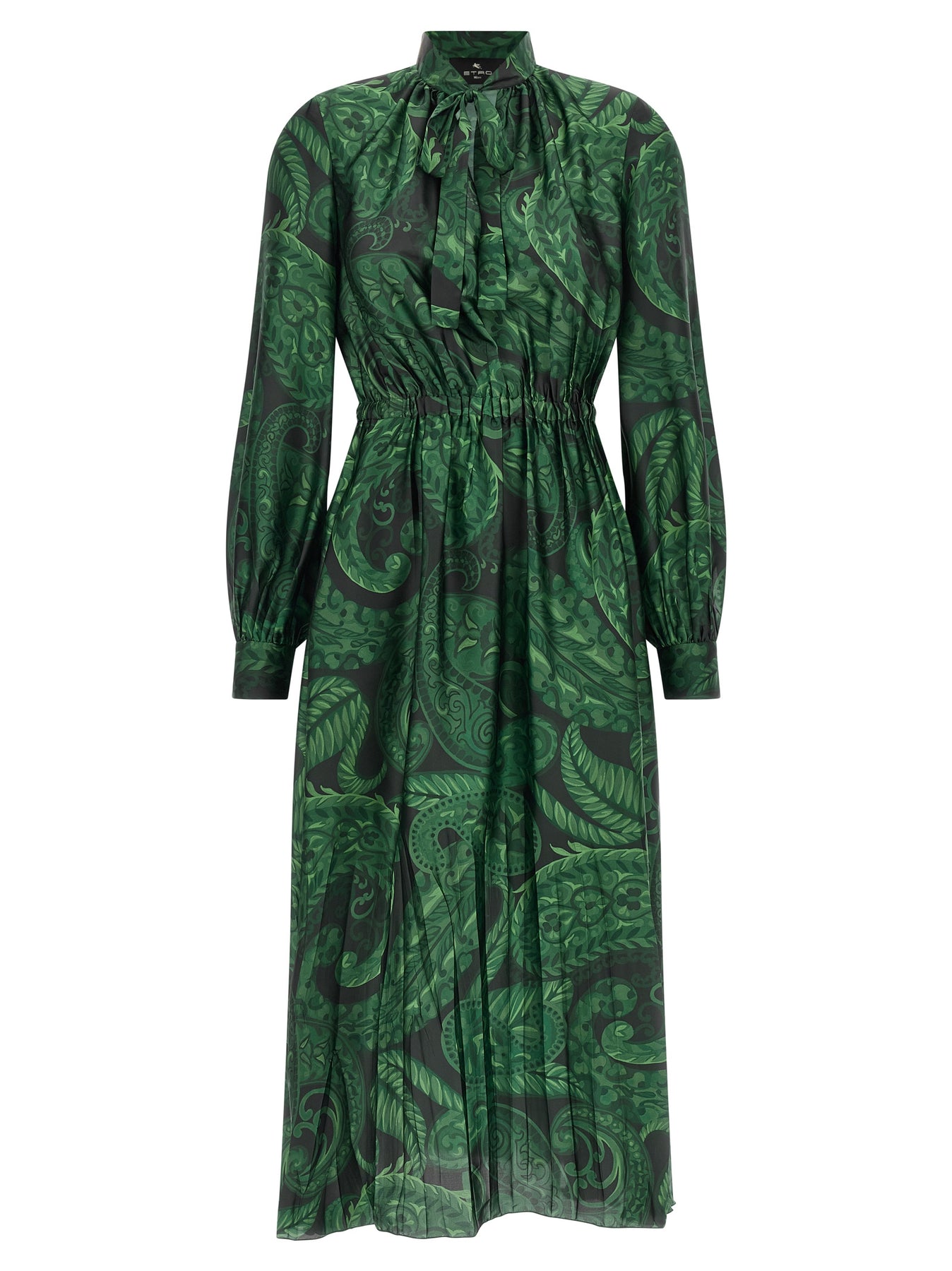 Midi dress in floral print cady, crew neck with front teardrop cut-out detail and ribbon, elastic waistband, flared skirt with pleated hem, pockets, long sleeves with shirt cuffs.