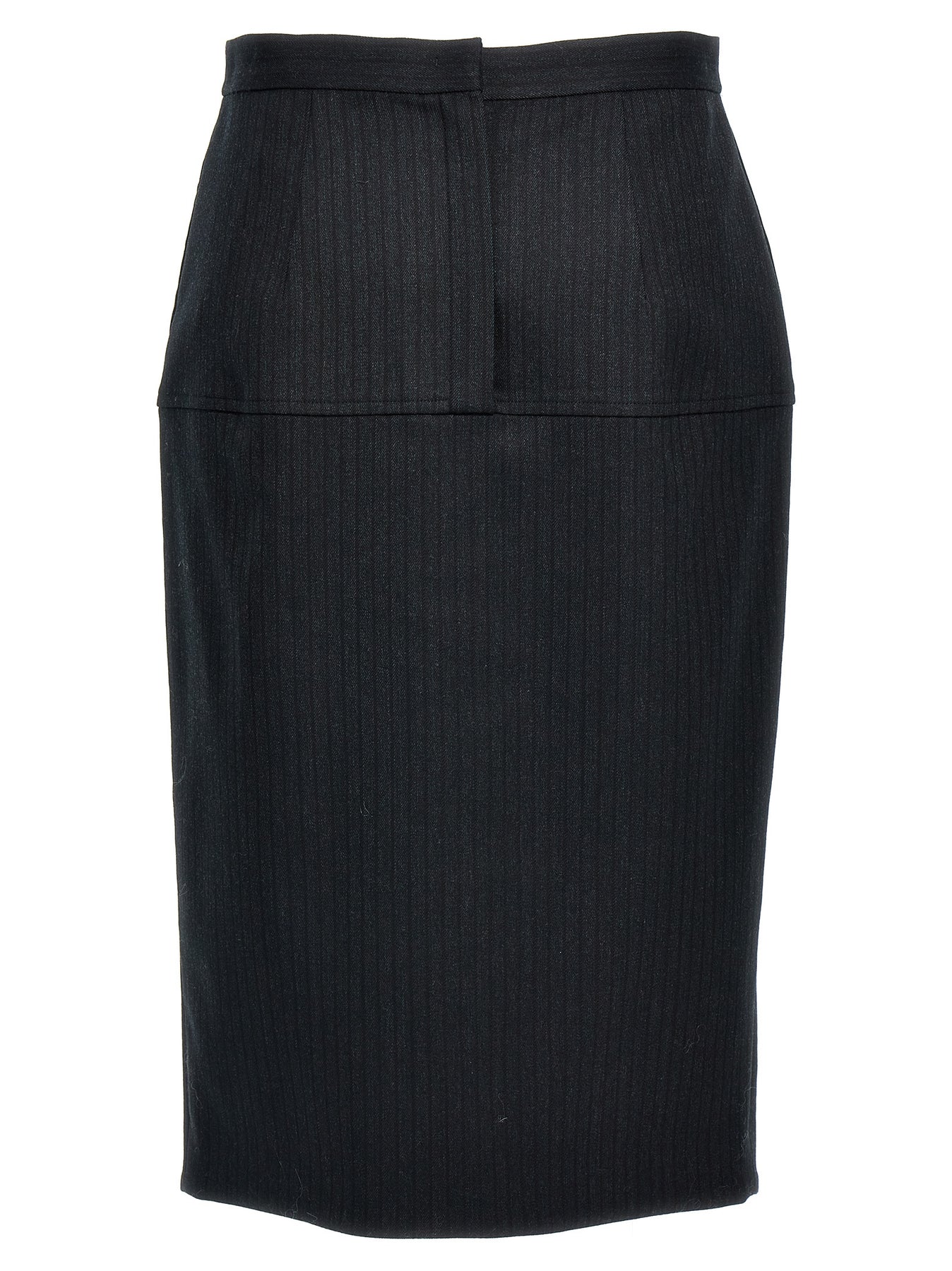 Pinstripe wool skirt, sheath dress, pockets, zip, hook and back button closure, diagonal front split.