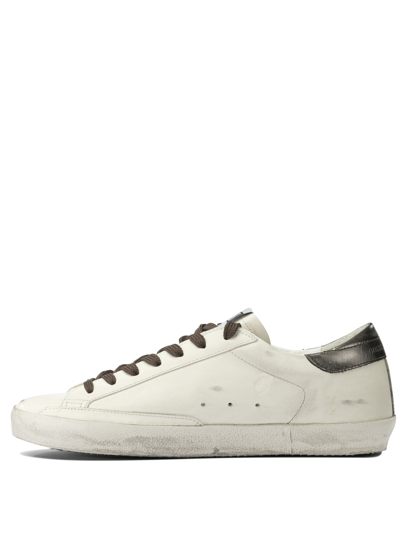 Golden Goose "Super-Star" sneakers with leather upper, low-cut construction and rounded silhouette. The construction features a hammered leather applique star on one side and laminated leather heel, which contrasts in texture and finish from the rest of the shoe. Vintage-treated finish, with raw-cut edges and visible details of the craftsmanship. Rubber sole stitched to the upper. || - Leather upper - Hammered leather side star - Laminated leather back heel - Vintage treatment on the surface - Rubber sole - Cotton laces - Leather and fabric lining - Regular fit