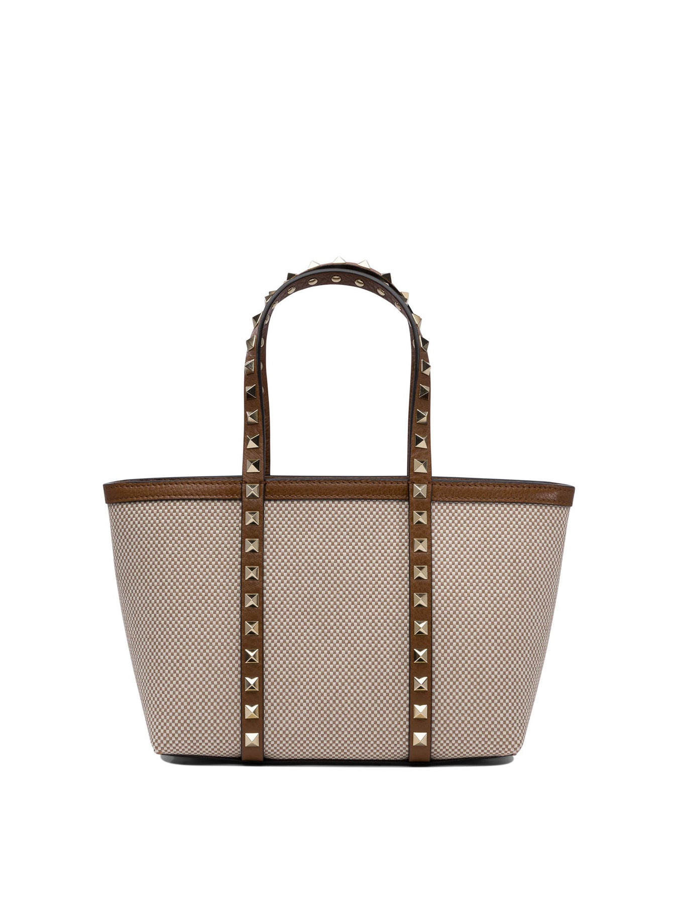 Valentino Garavani "Rockstud" tote bag made of natural canvas with rigid structure and leather details. Studs and accessories feature uniform palladium finish. Leather top handle allows for hand carrying. The top closure is zippered for secure protection of personal items. The clean, compact silhouette is complemented by visible stitching that follows the line of the bag. || - Natural canvas with leather details and handle - Palladium finish studs and accessories - Zipper closure on top - Adjustable and removable shoulder strap - Open interior pocket