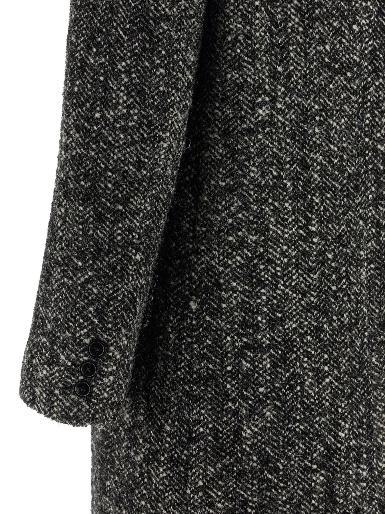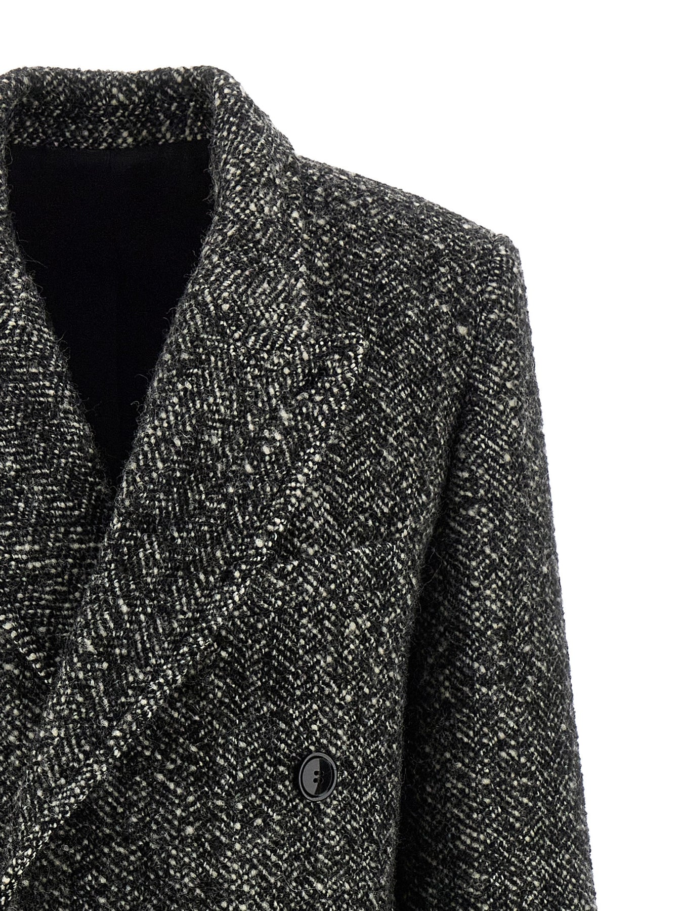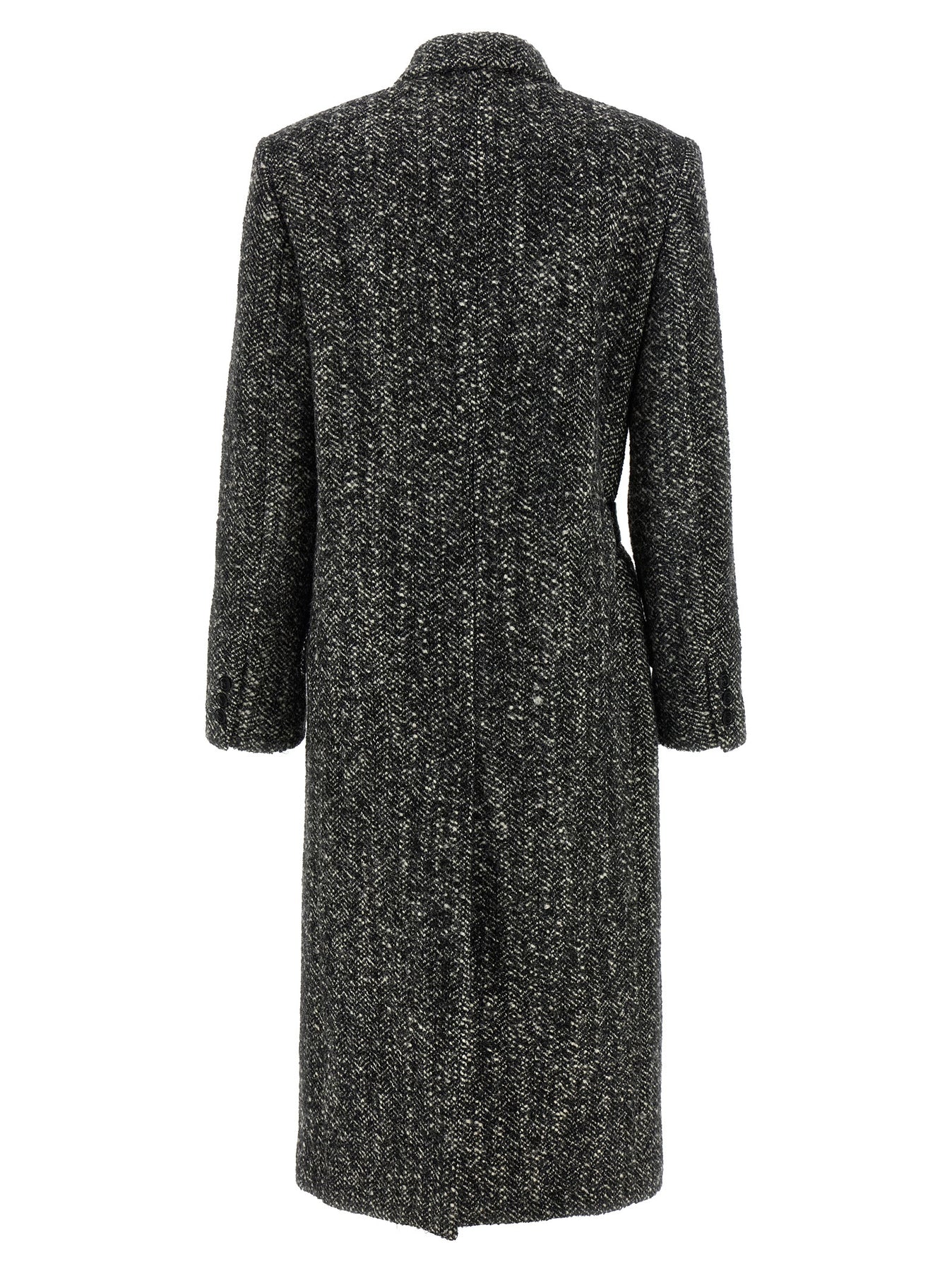 'Ebyane' coat in herringbone virgin wool blend with double-breasted neckline with peak lapels, button closure and adjustable side strap with buckle, back split, long sleeves with cuffs.