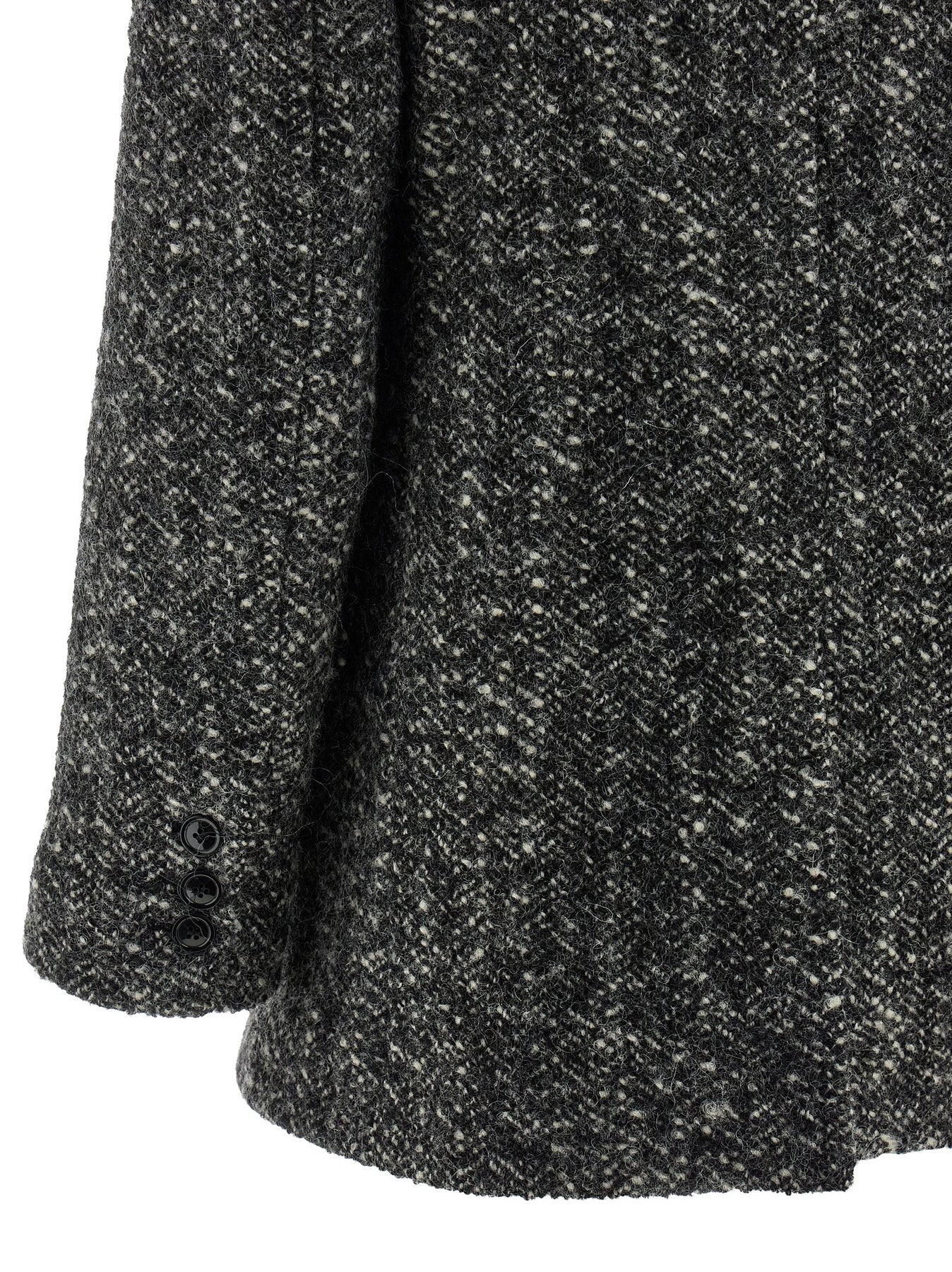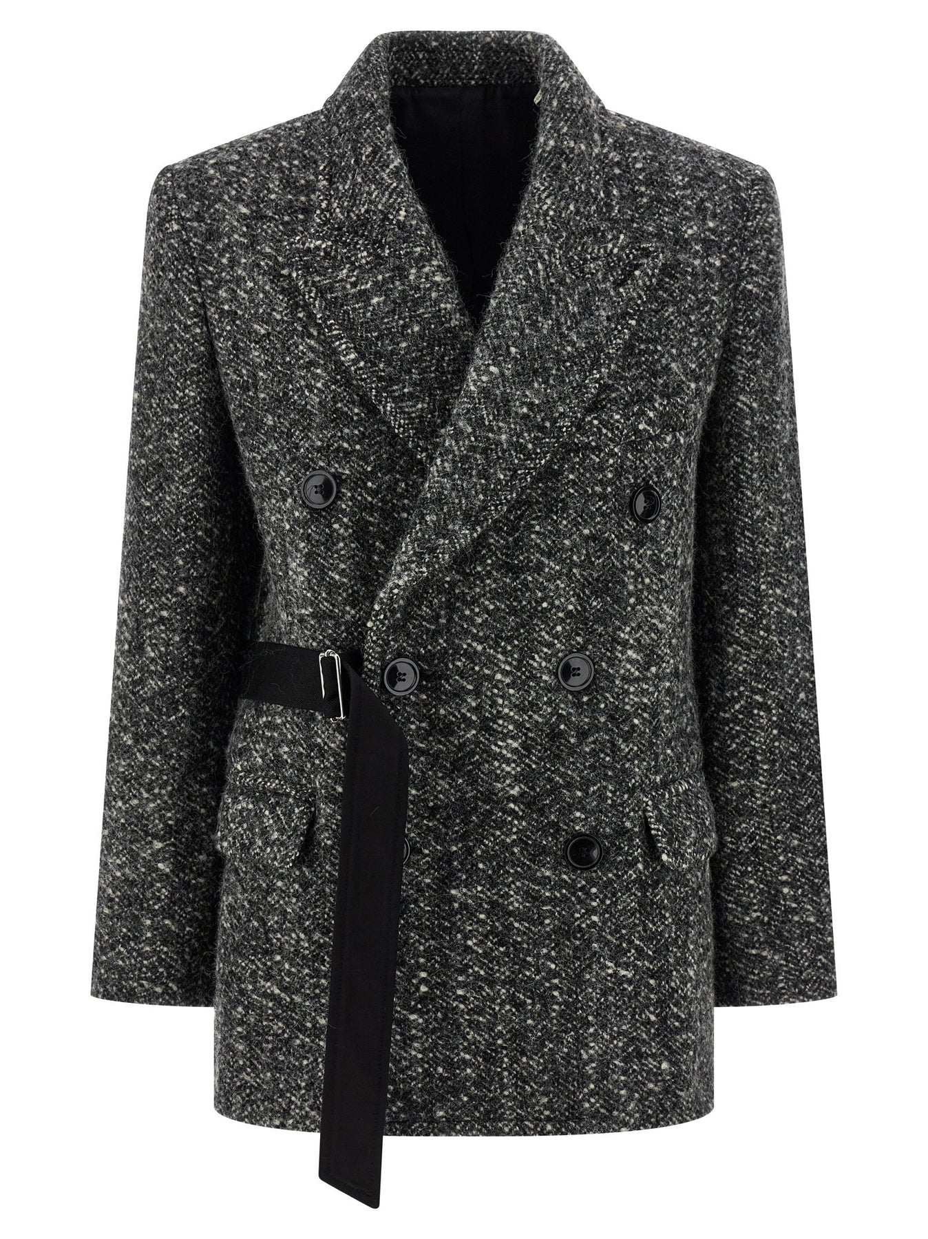 'Ezzia' herringbone wool blend jacket with peak lapel neckline, double-breasted closure, adjustable side tape with buckle, side pockets, back central split, long sleeves with cuffs and buttons.