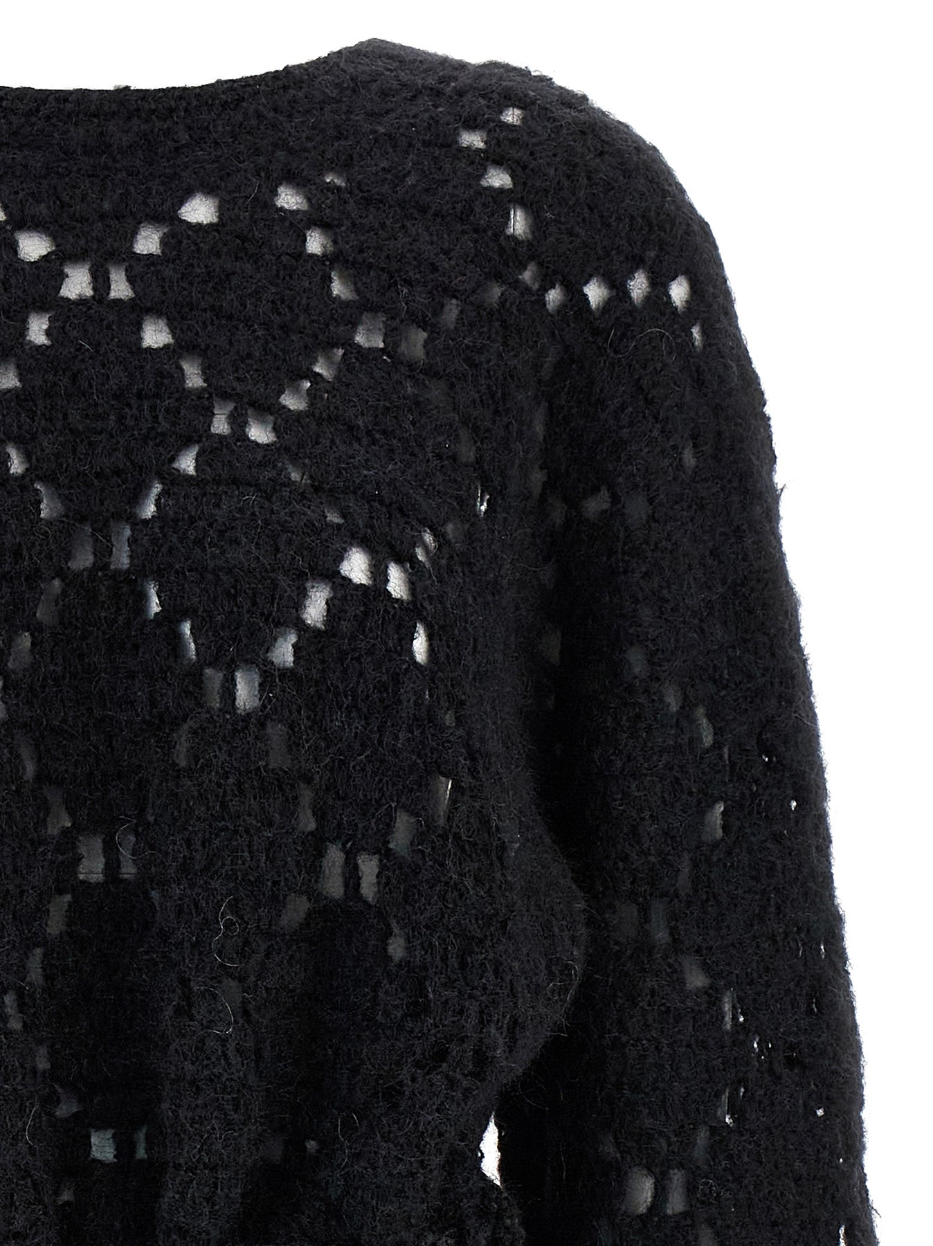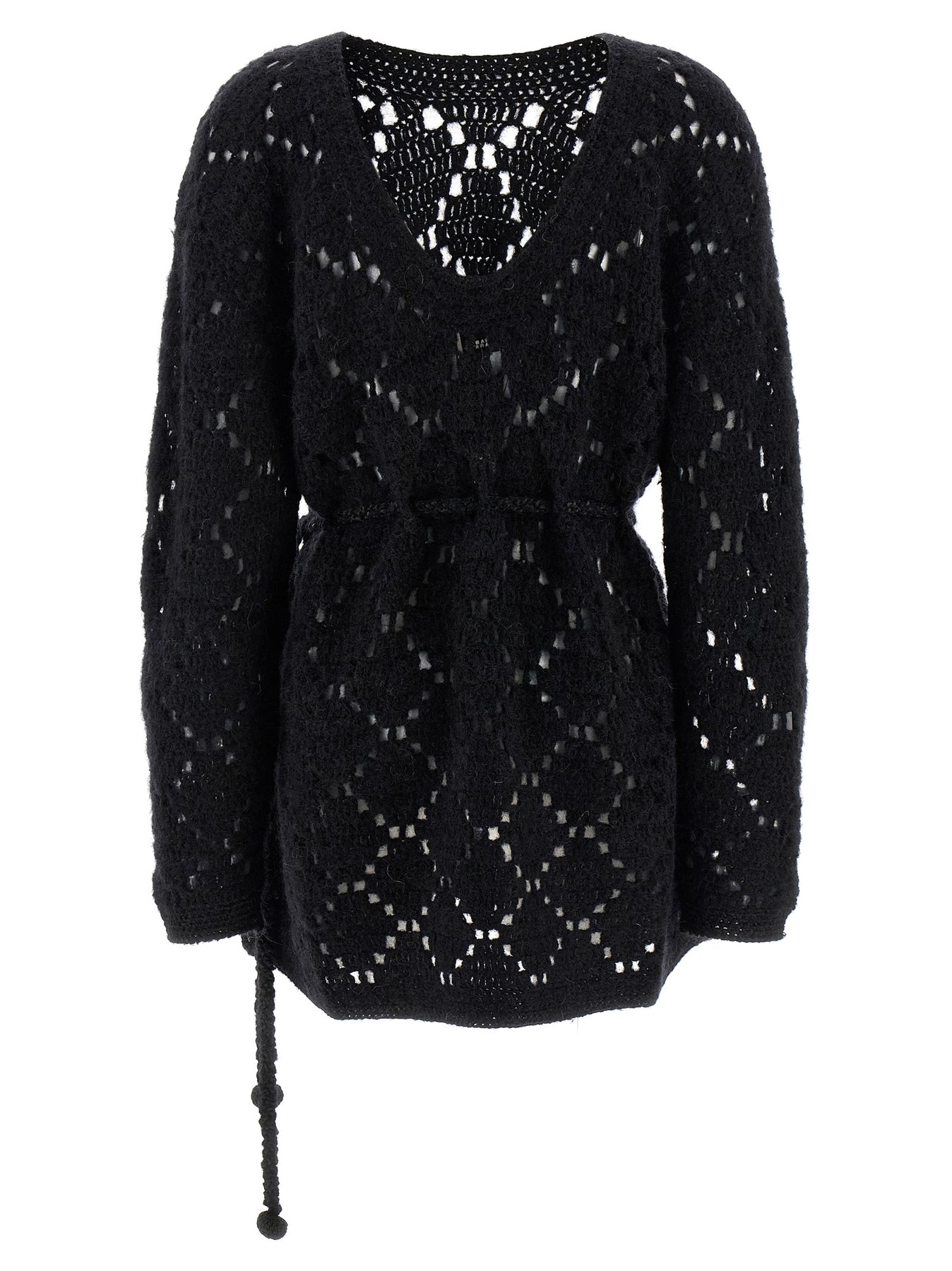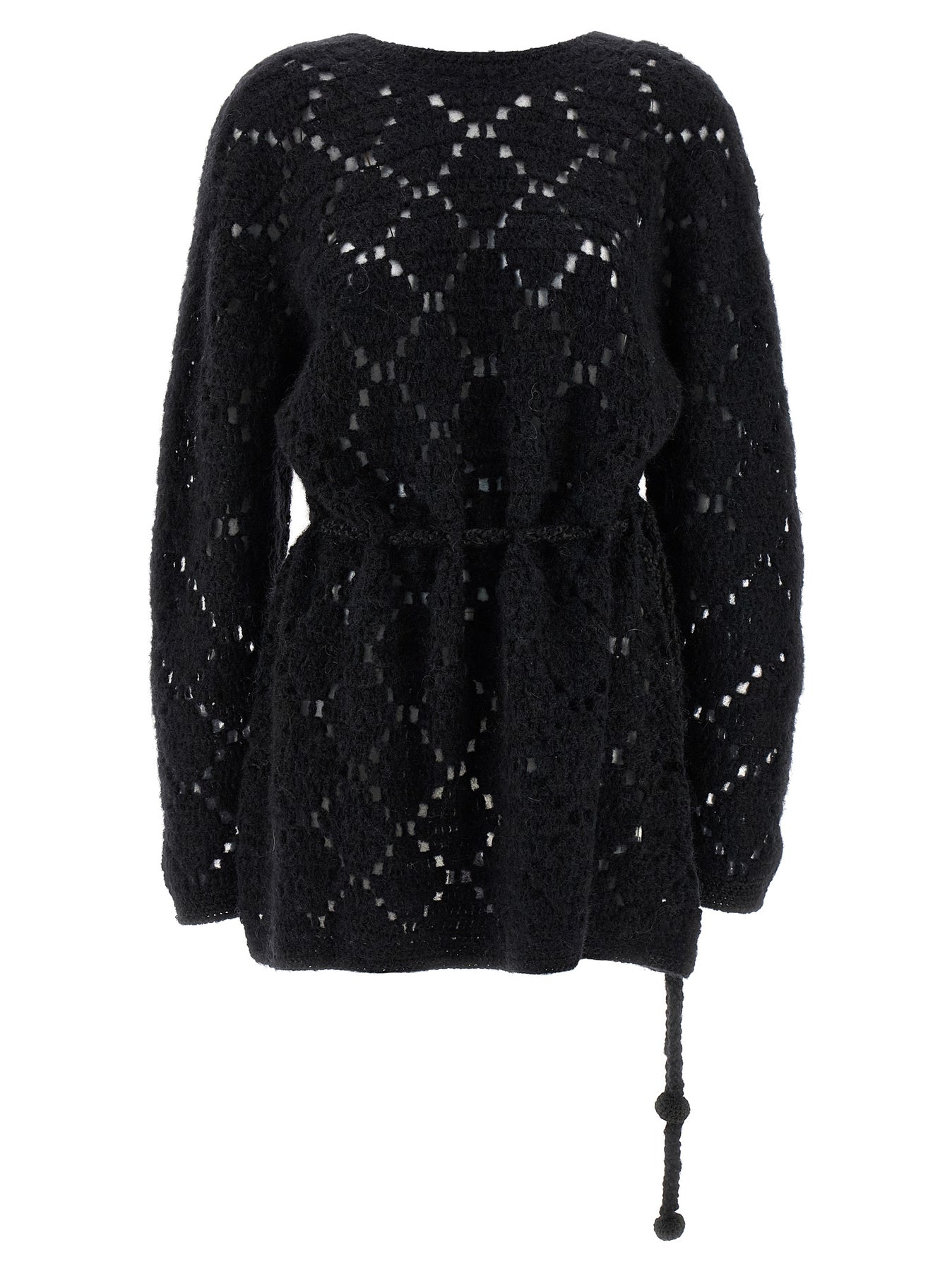 'Merida' sweater in perforated mohair handmade crochet technique, round back neckline, adjustable drawstring at the waist finished with pompoms, long sleeves.