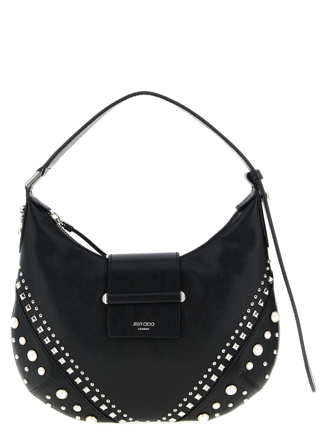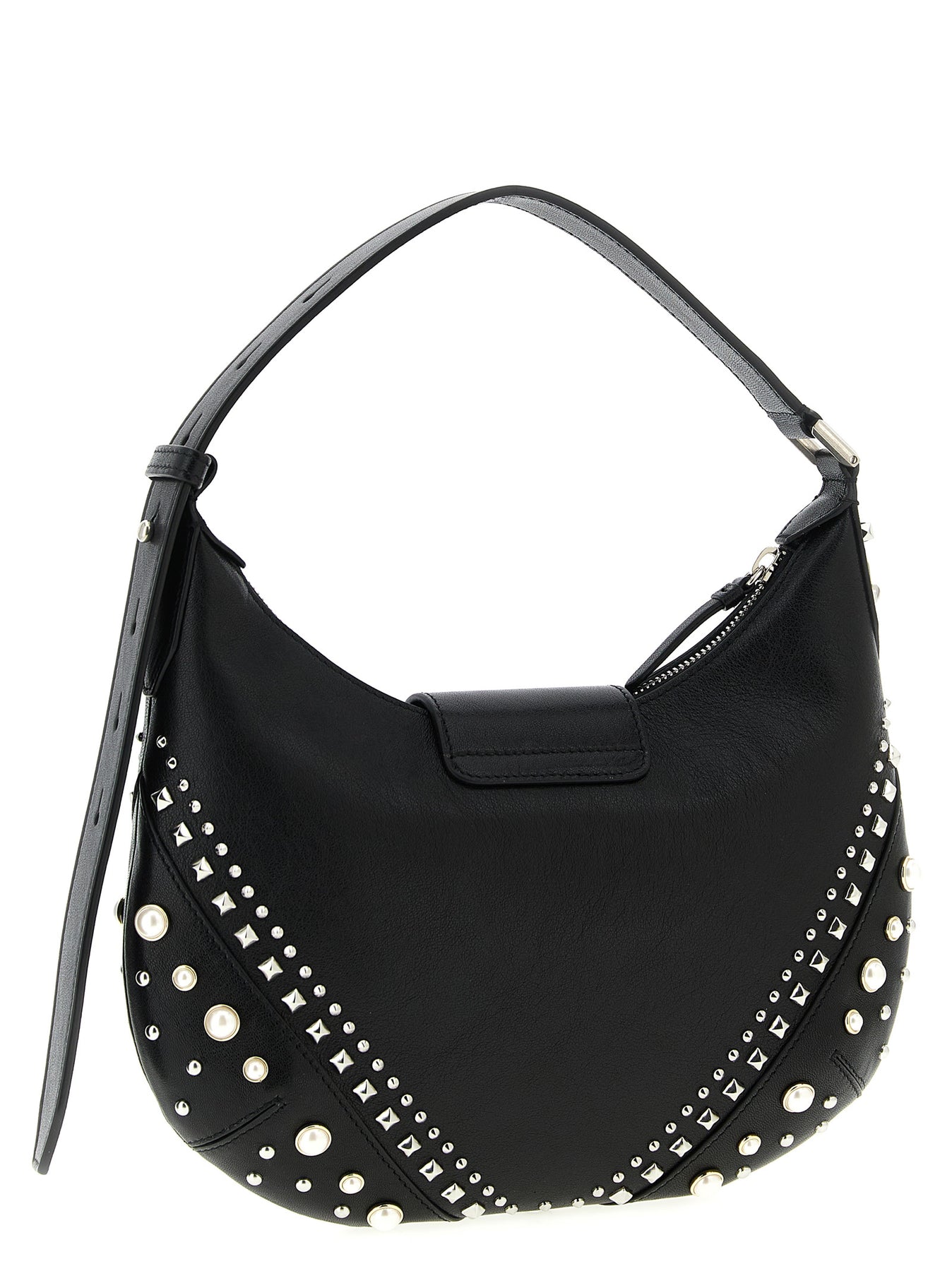 Small 'Bar Hobo' shoulder bag in biker leather, adjustable handle, buckle closure, metal stud and pearl application detail.