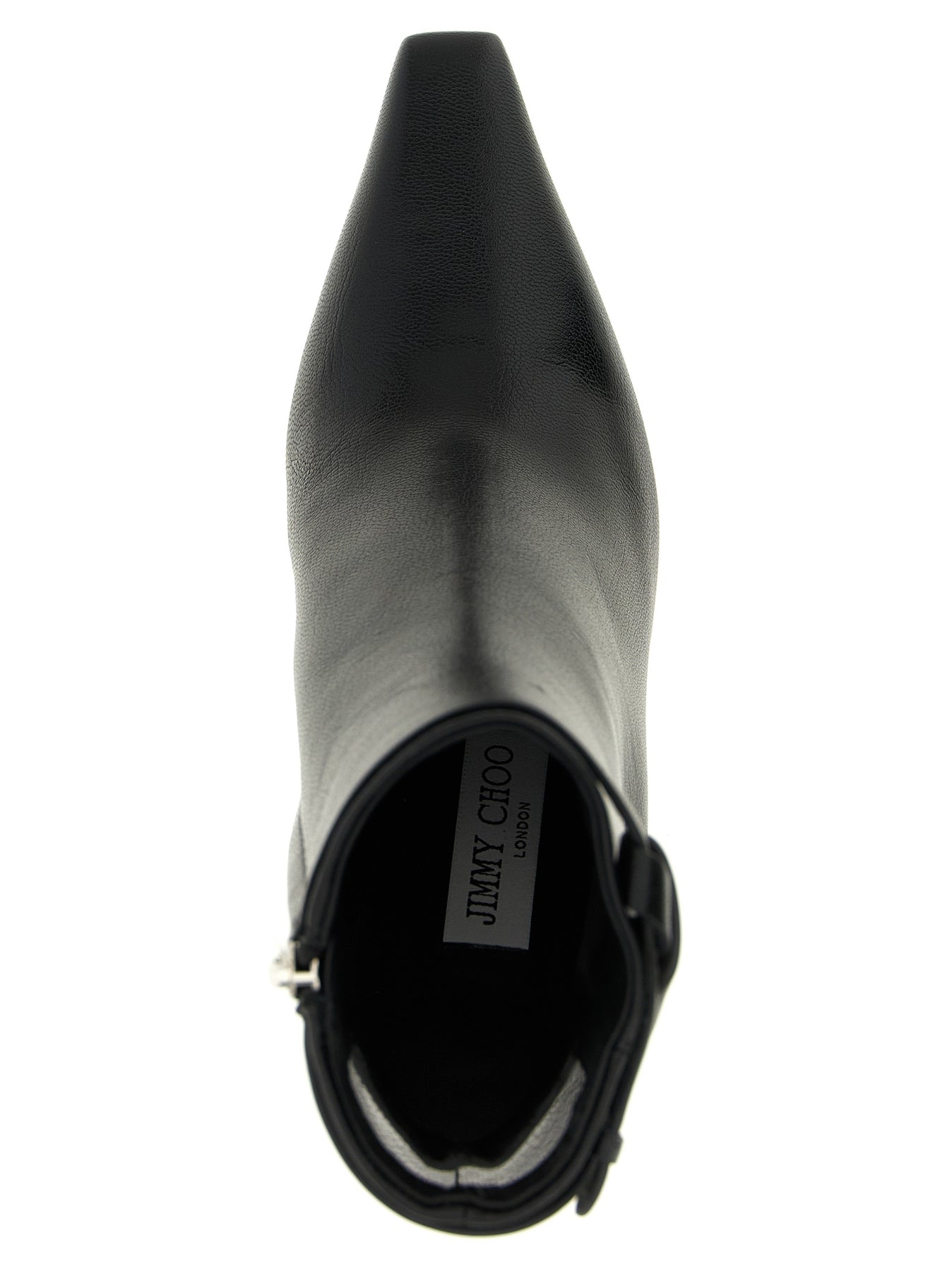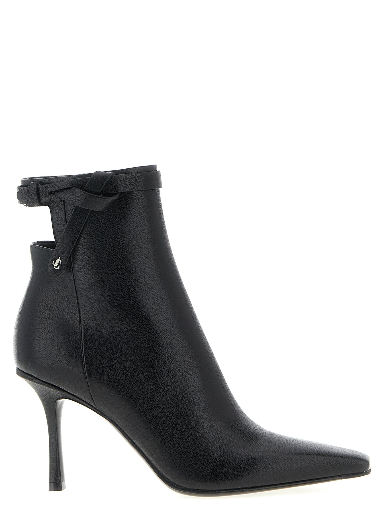 'Camie' shiny kidskin leather ankle boots with square toe, back cut-out detail with strap, side zip closure, stiletto heel, leather sole.
