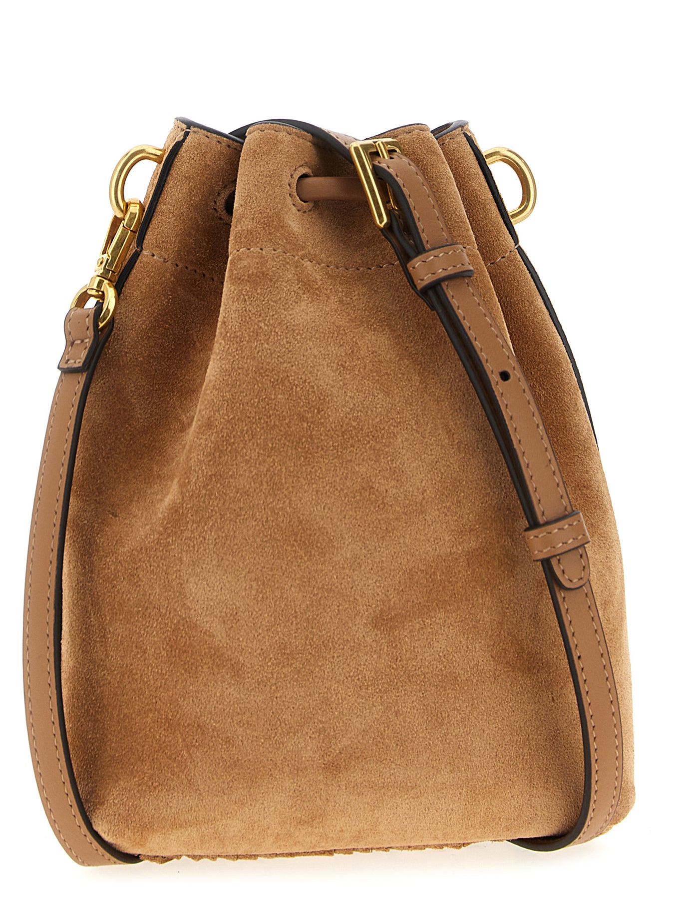 'Cinch' mini bucket bag in suede with cascading fringes, drawstring closure with 'Diamond' metal clip, adjustable and removable shoulder strap.