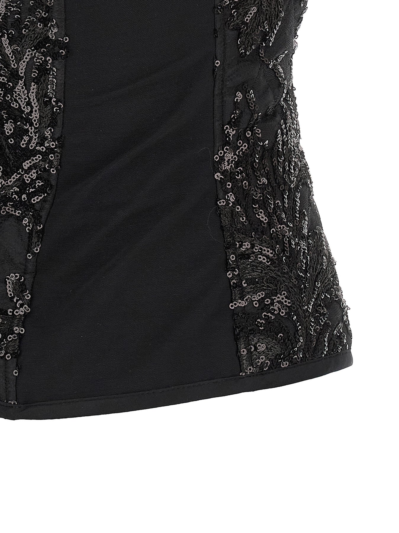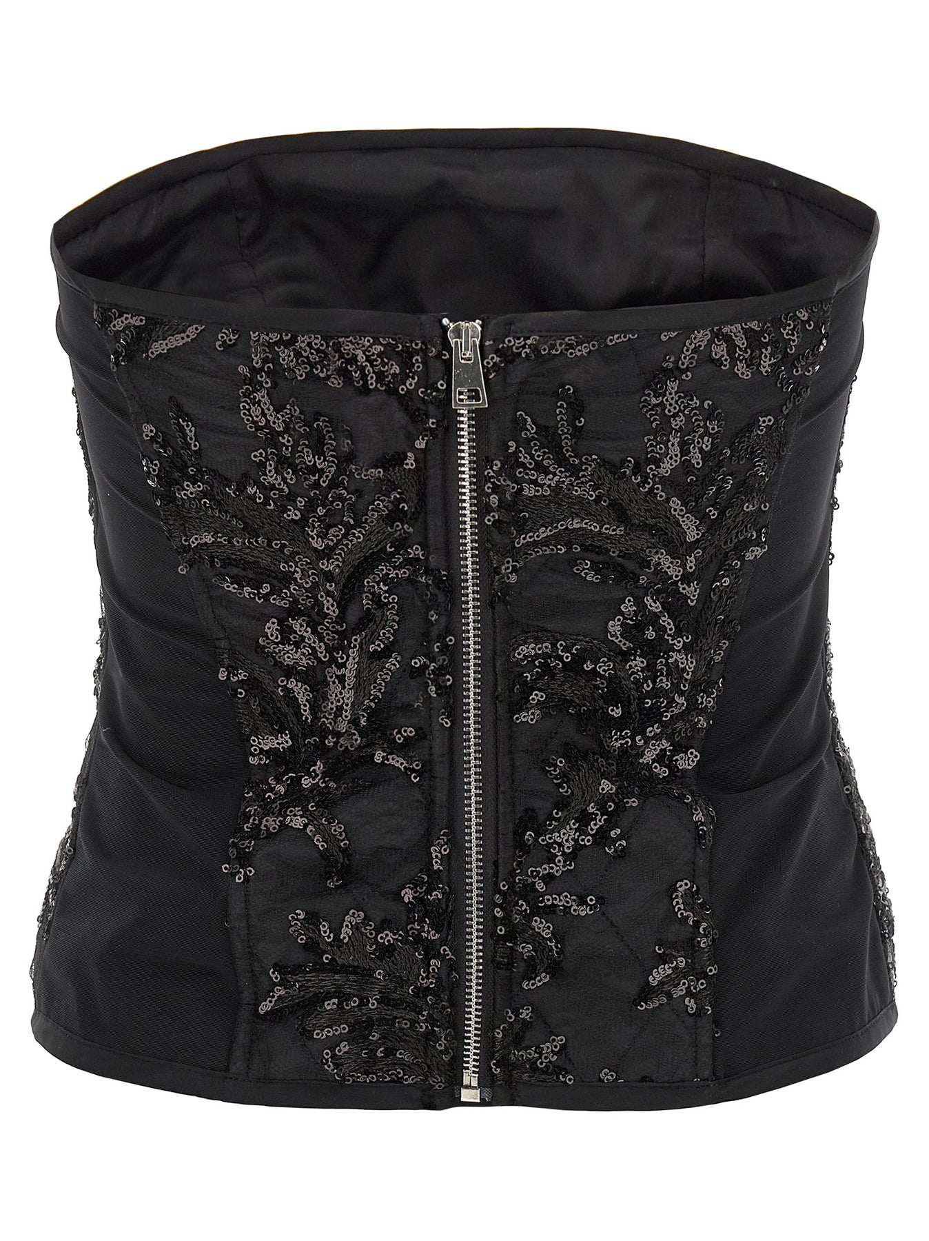 Elodie' top in quilted fabric covered in lace with sequin appliqué, off-the-shoulder bandeau model, and back zip closure.