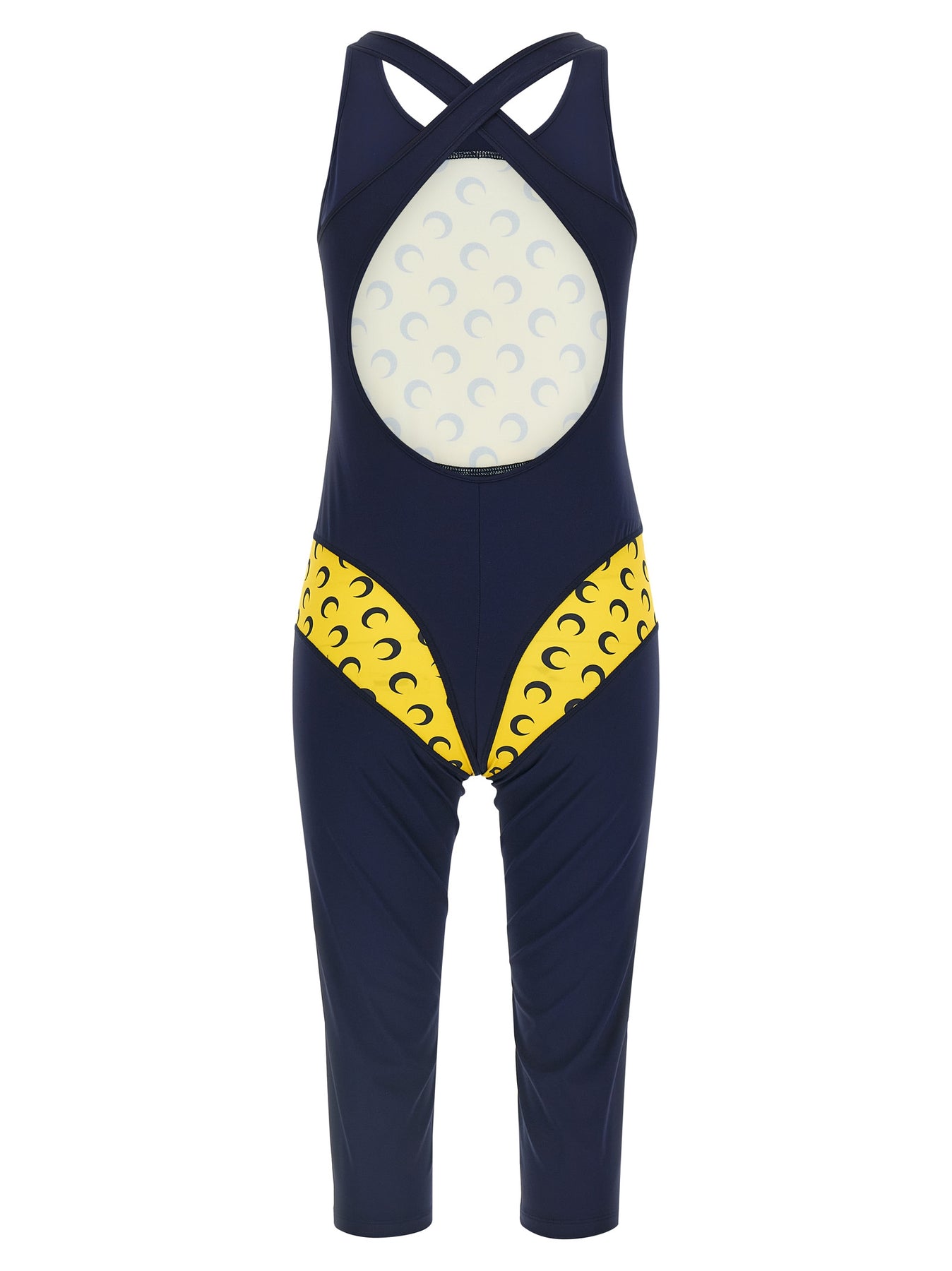 'Athleisure' stretch fabric catsuit with 'All Over Moon' logo print fabric inserts, round neckline on the front, crossed shoulder straps at the back with cut-out detail, sleeveless, cycling leg.