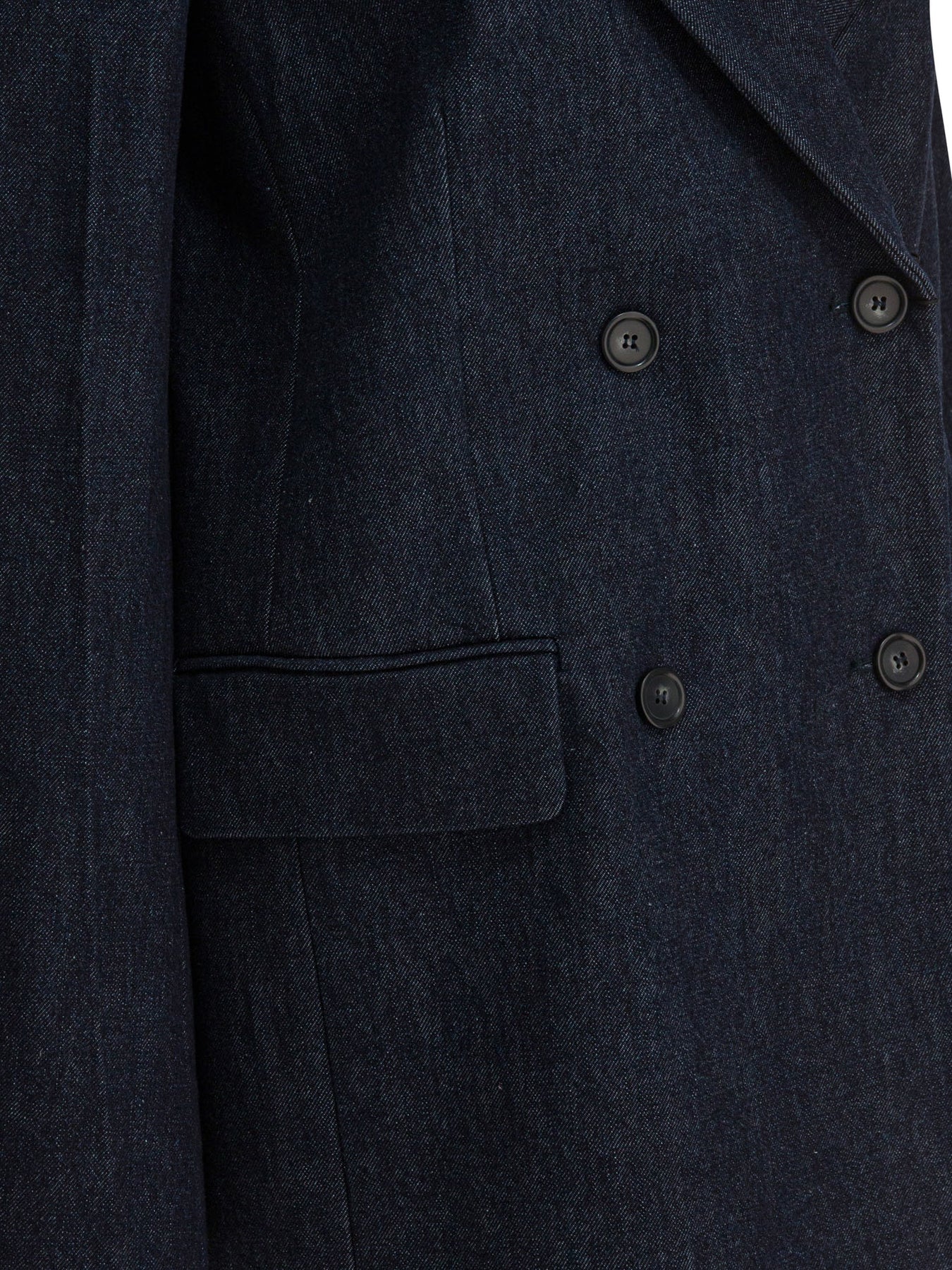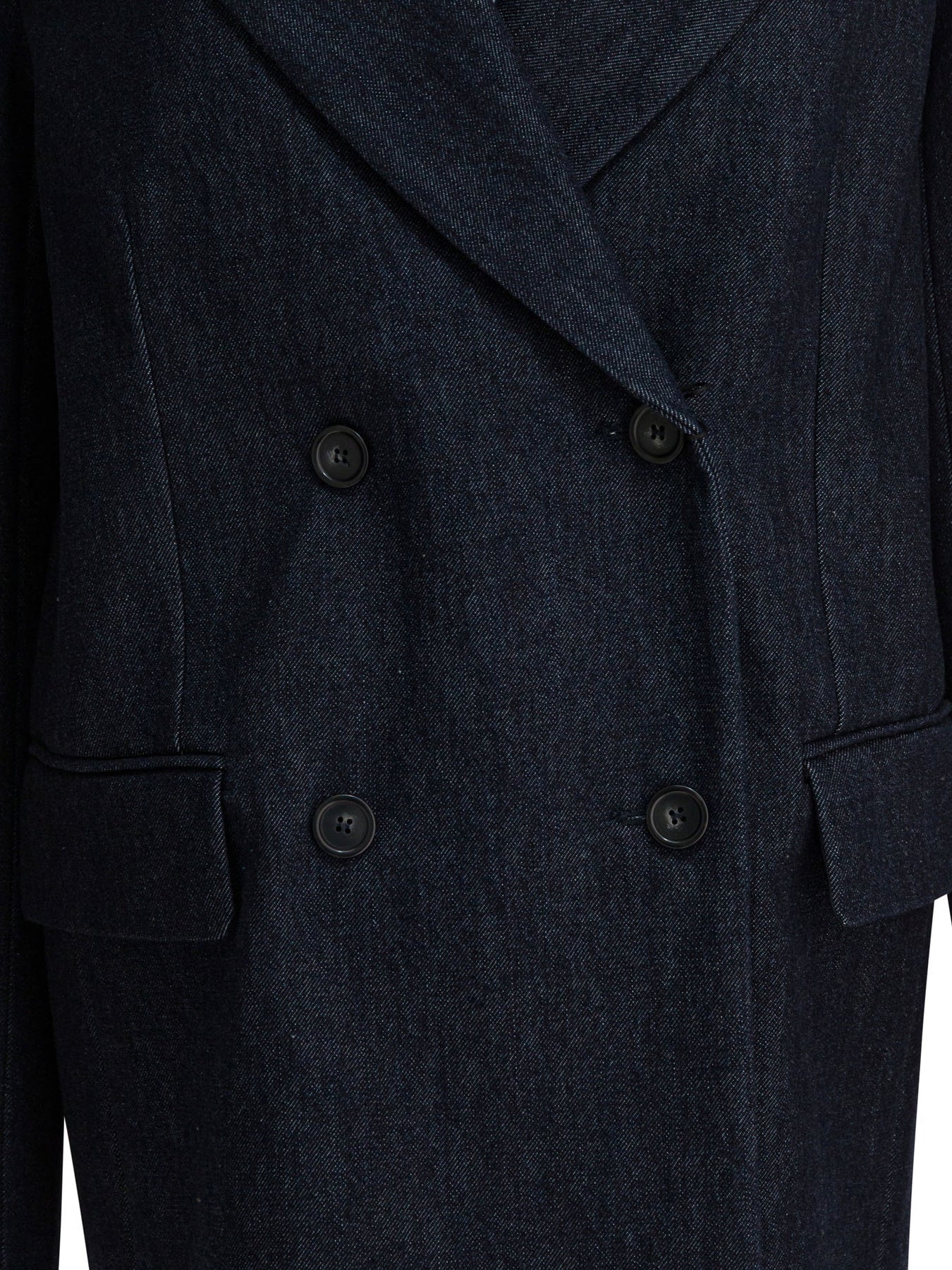Max Mara Sportmax oversized double-breasted blazer, made of firm denim with raw treatment and full texture. Broad-shouldered construction and relaxed fit, with spear lapels and double-breasted button closure. Presence of inner lining, center back slit, wide volume silhouette and oversized fit. Offers a loose fit and marked structure. || - Solid color - Inner lining - Peaked lapels - Double-breasted button closure - Central back slit - Wide shoulders - Oversize fit