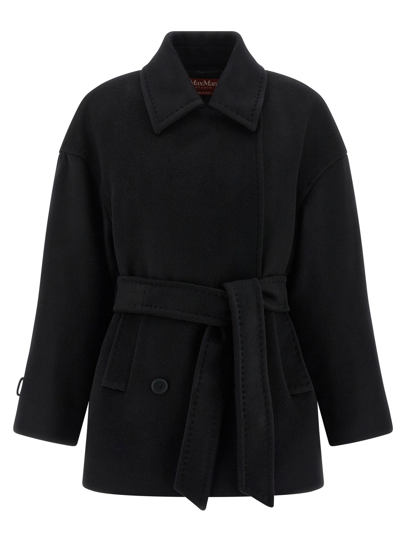 Pausa' virgin wool coat with viscose lining, double-breasted style with front button closure, shirt collar, pockets, long sleeves with dropped shoulders and removable leather-effect fabric straps, removable matching wool belt, removable leather-effect fabric belt.
