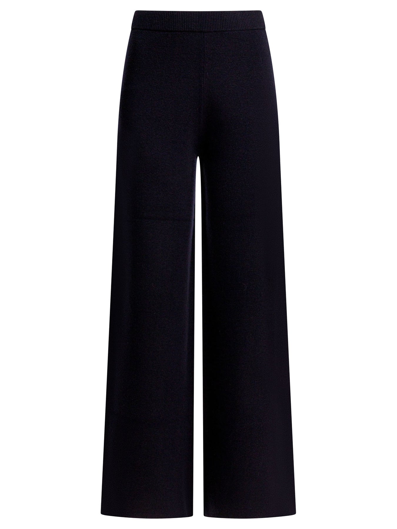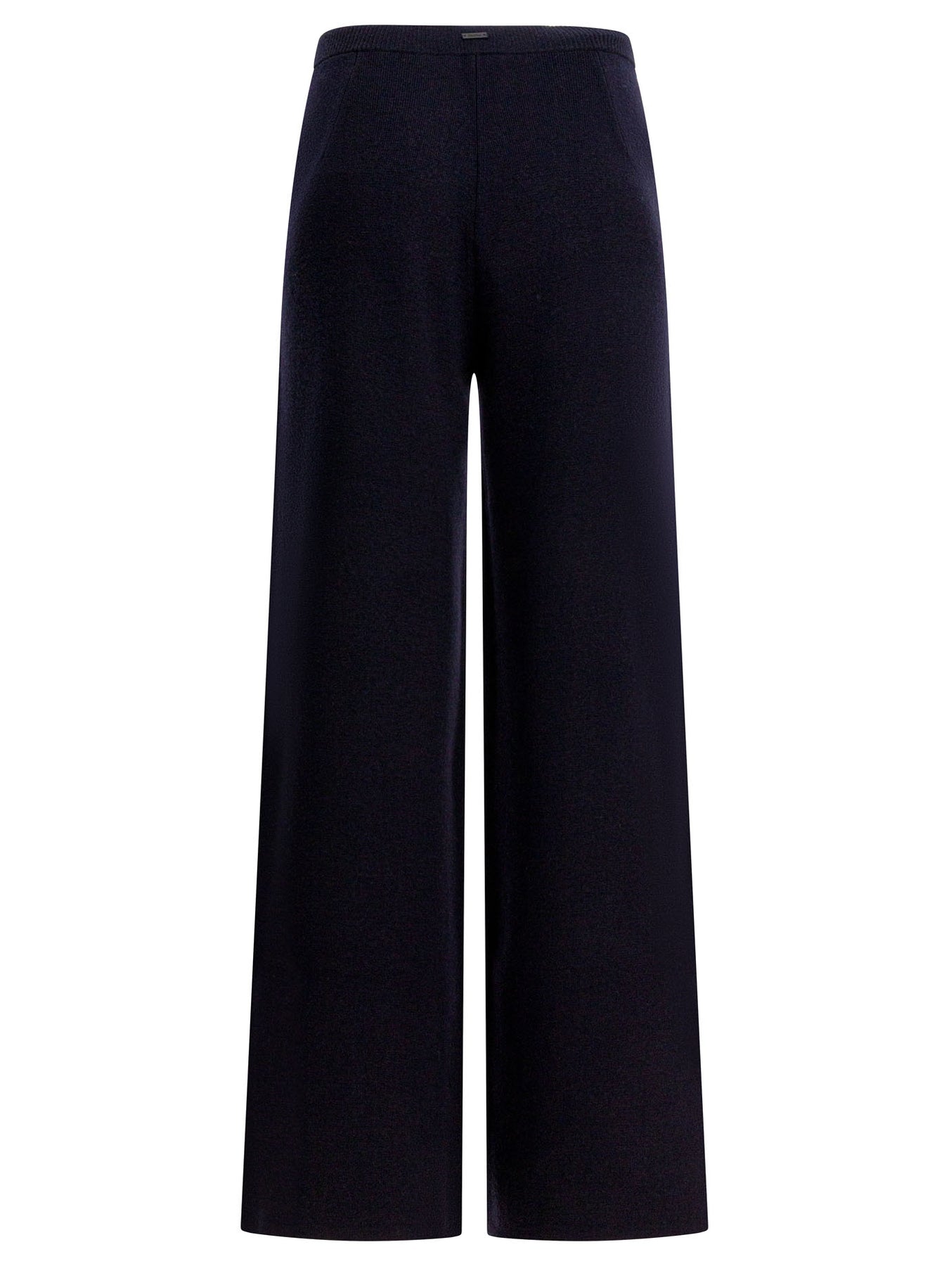 Max Mara wool and cashmere pants, made of blended yarn and worked in cloth stitch. They present a straight silhouette with a long structure, featuring an elasticized waistband finished with ribbing. Darts sewn into the waist at the back enhance the shape and fall of the garment. Completing the construction is the logo tag centrally placed on the back of the waistband. || - Solid color - High waist - Fabric stitch work - Ribbed elastic waistband - Sewn-in darts at the back waist - Logo plaque on back waistband - Relaxed fit