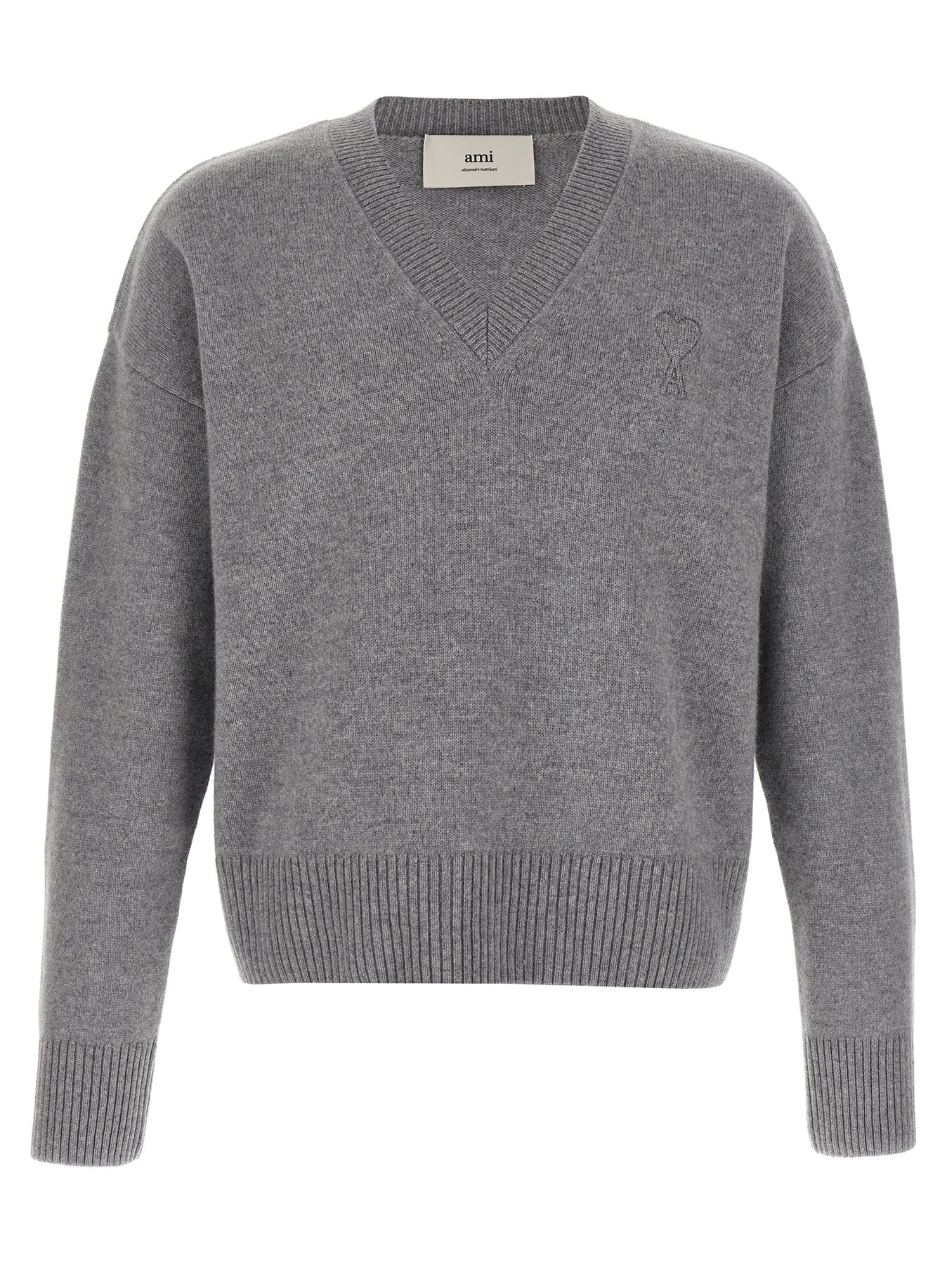 Wool and cashmere sweater with tone-on-tone puff logo patch on the front, V-neck, long cuffed sleeves and dropped shoulders.