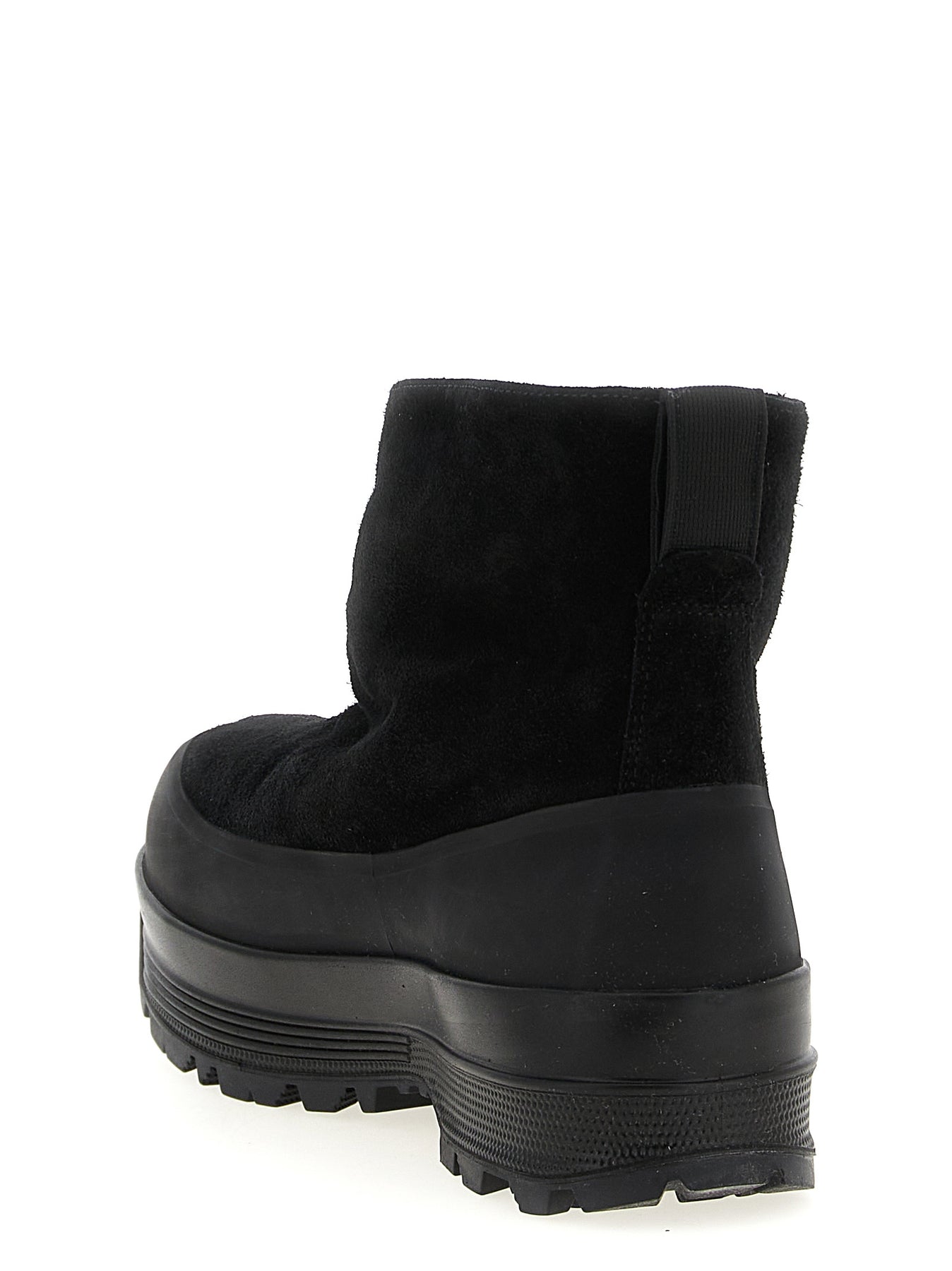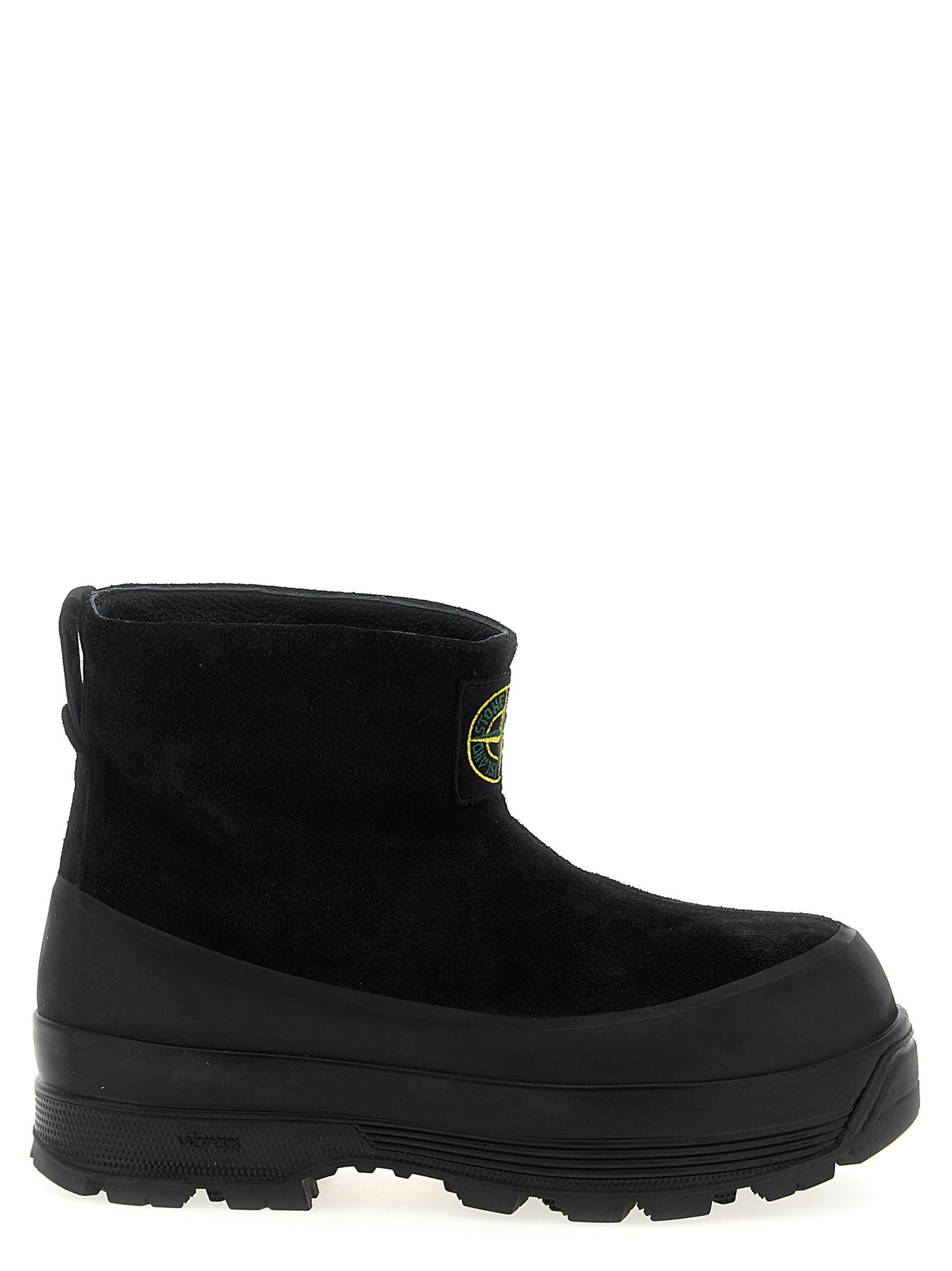 Suede ankle boots finished with wide rubber band, front logo patch, pull-on model, Vibram rubber sole.