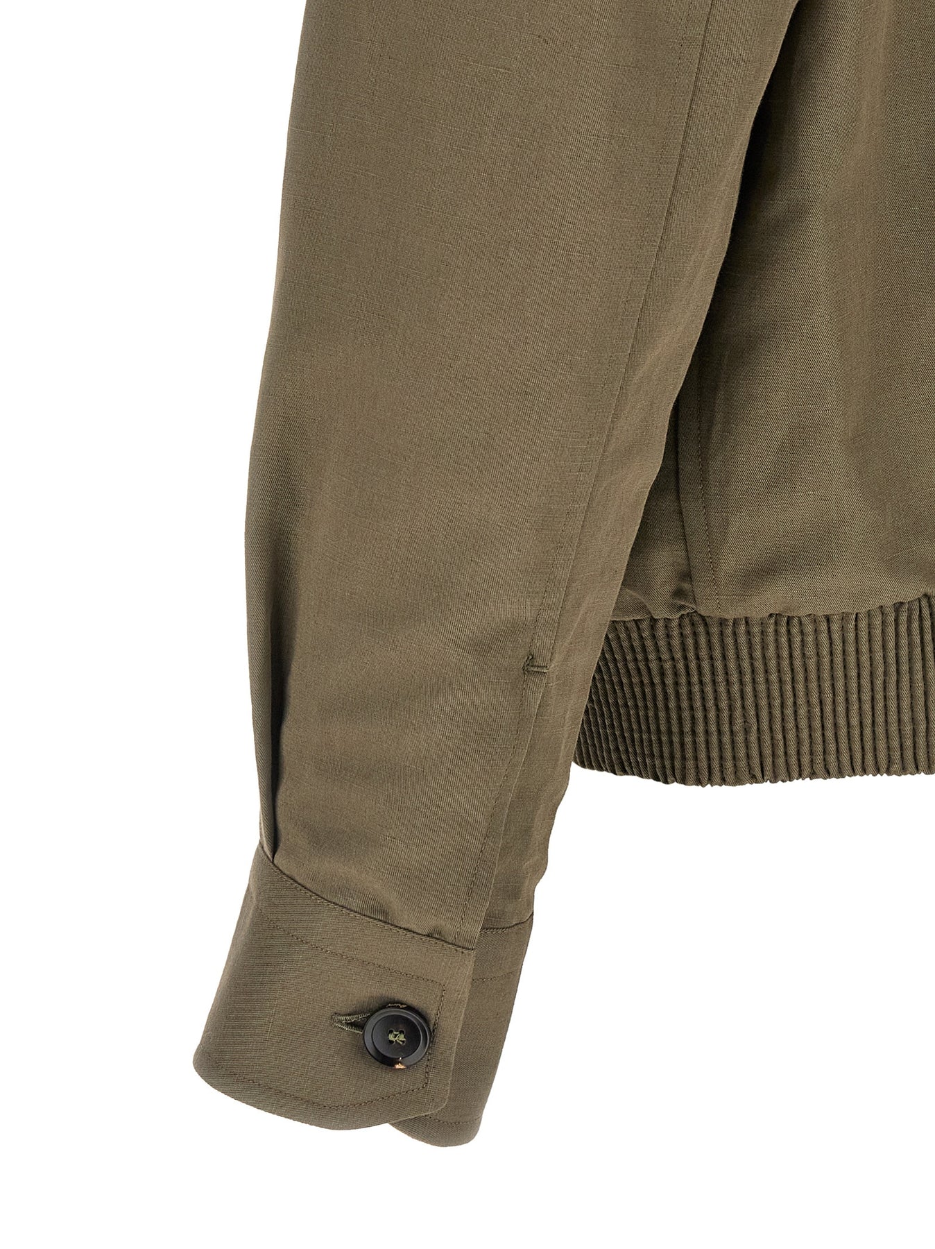 Linen and cotton blend blouson, unlined, shirt collar, front zip closure with contrasting leather detail, pockets, long cuffed sleeves, elastic hem, leather patch with embossed logo on the back.