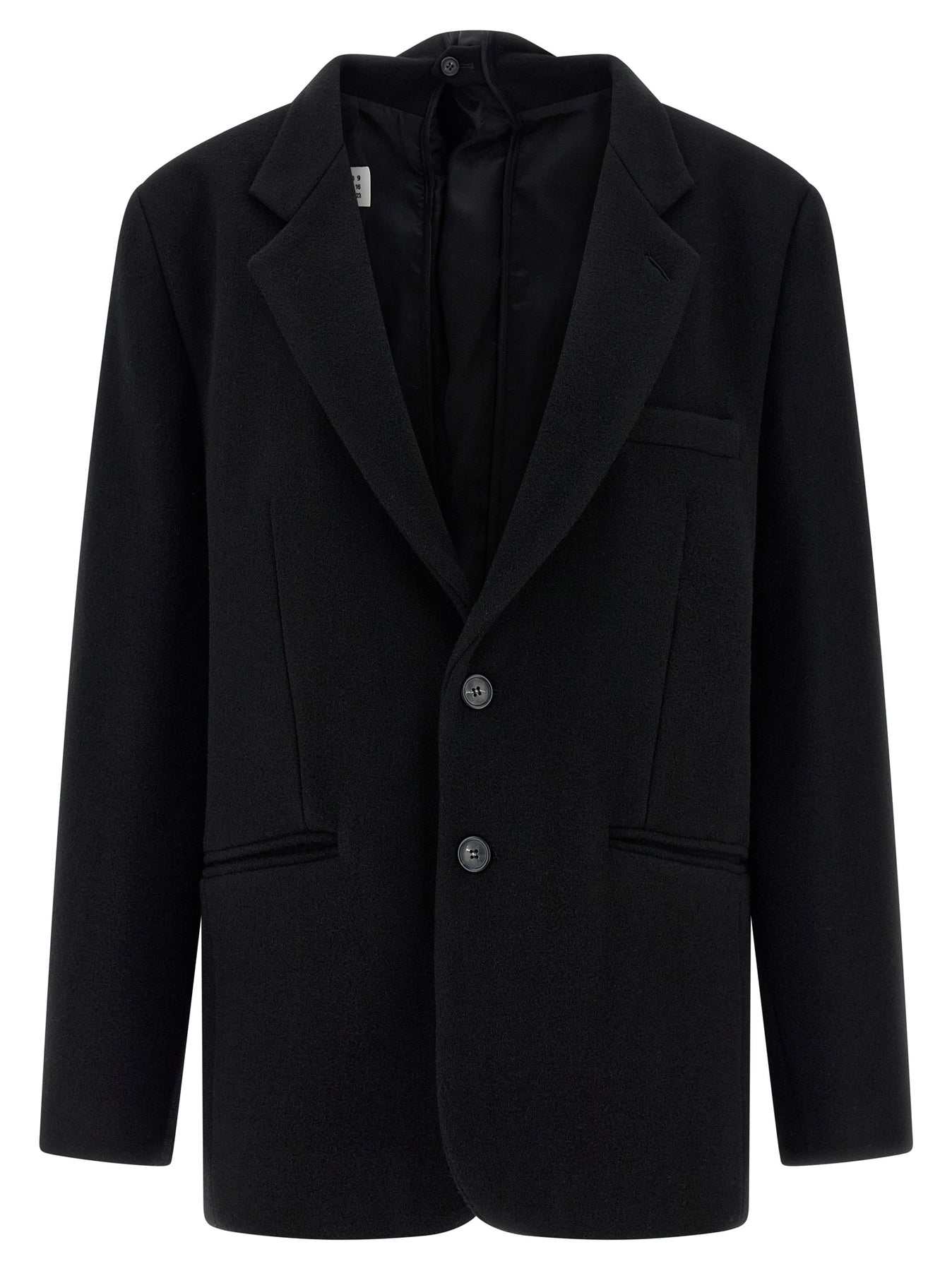 Single-breasted wool blazer with front button closure, mirror lapels, chest pocket, patch pockets, extra padded shoulder strap, long sleeves, tone-on-tone fabric back panel to adjust the width, and 'White stitch line' at the back.