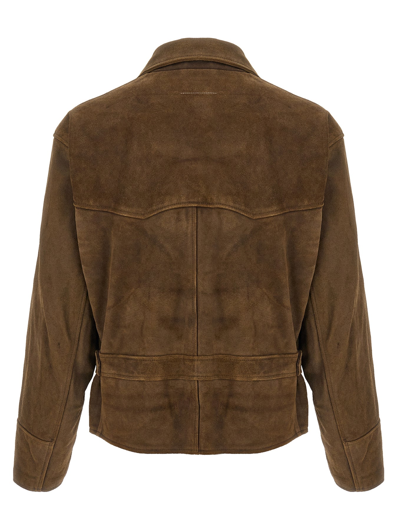 Aged effect suede jacket with a deliberately worn finish, quilted and slightly padded nylon lining, biker style, lapel collar, front asymmetrical zip closure, pockets, long sleeves with cuffs and dropped shoulder, back 'White Stitch Line', removable belt.