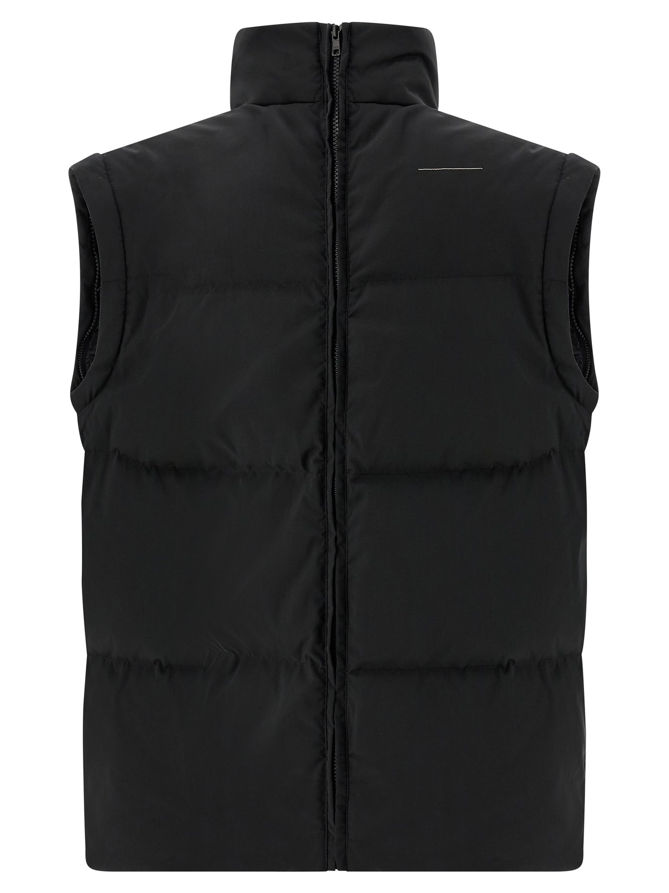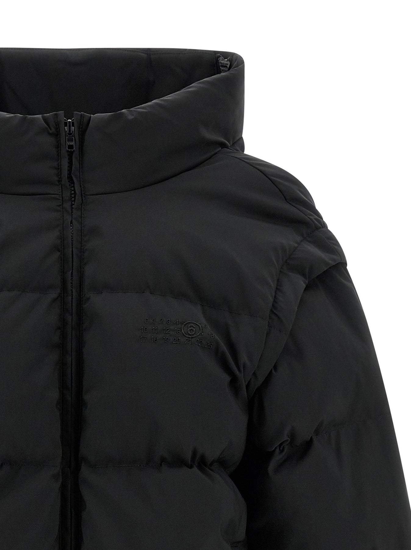 Quilted and goose feather padded fabric down jacket, tone-on-tone 'Numeric signature MM6' embroidery and front zip closure, funnel-shaped high neck, pockets, removable long sleeves with elastic, drawstring at the hem, back panel expandable with zip.