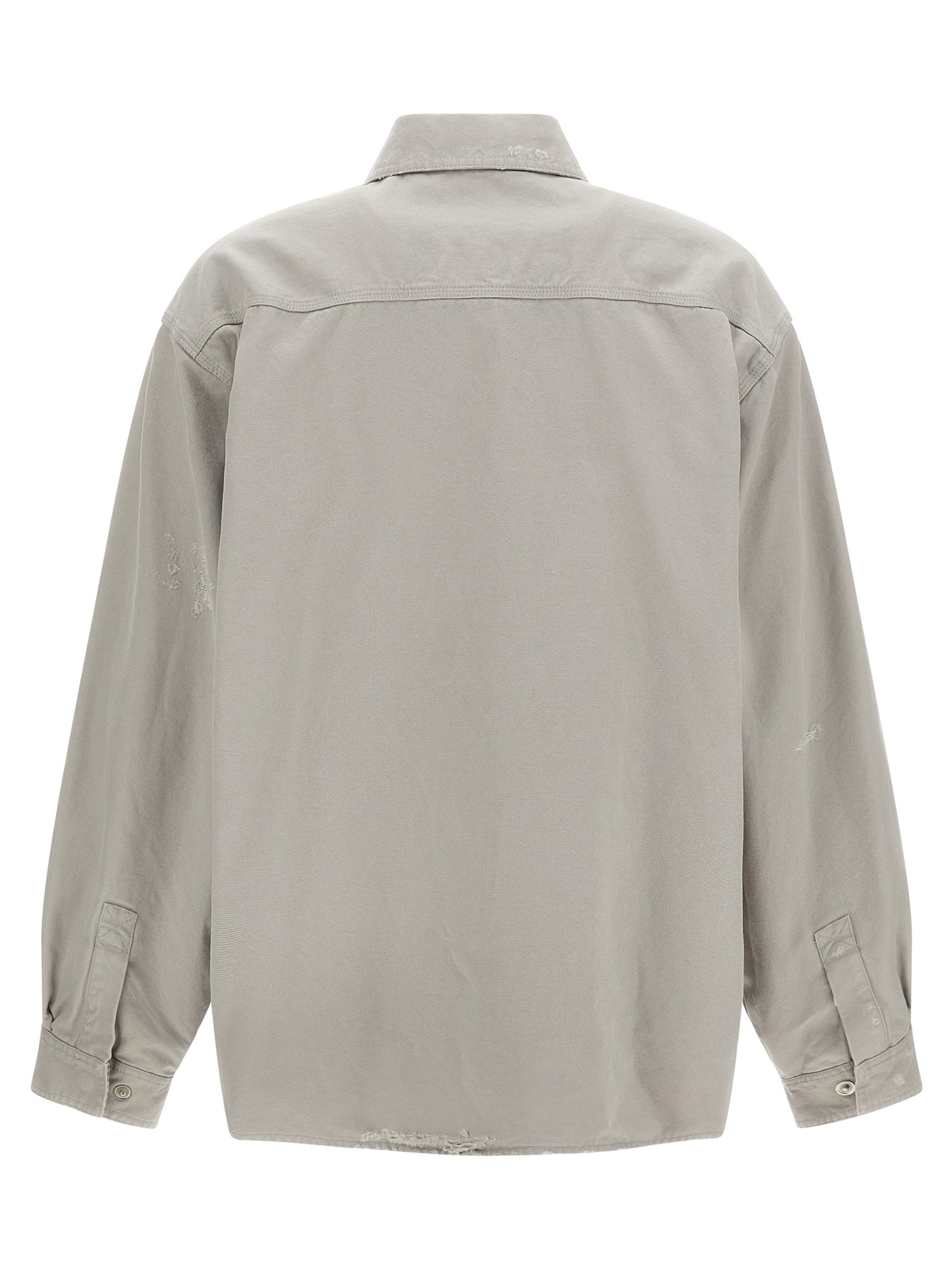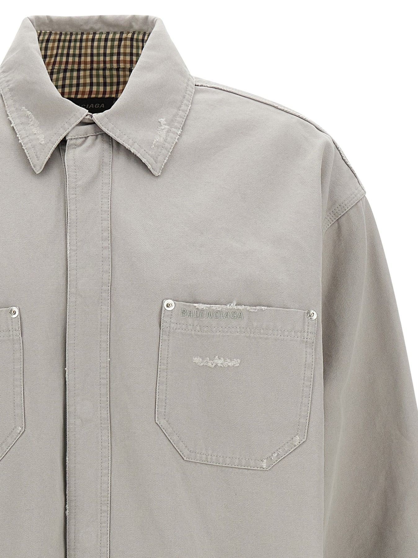 'Workwear' overshirt in heavy used-effect cotton canvas, contrasting patterned cotton lining, tone-on-tone logo embroidery and front snap button closure, pockets, long sleeves with cuffs and dropped shoulders.