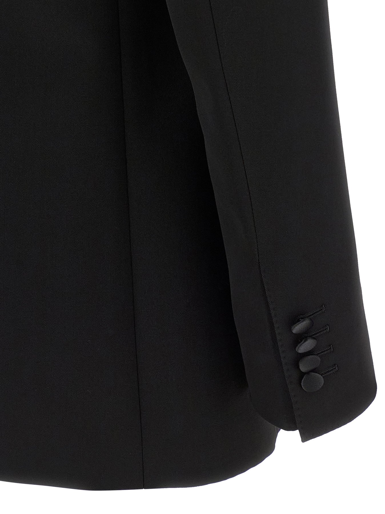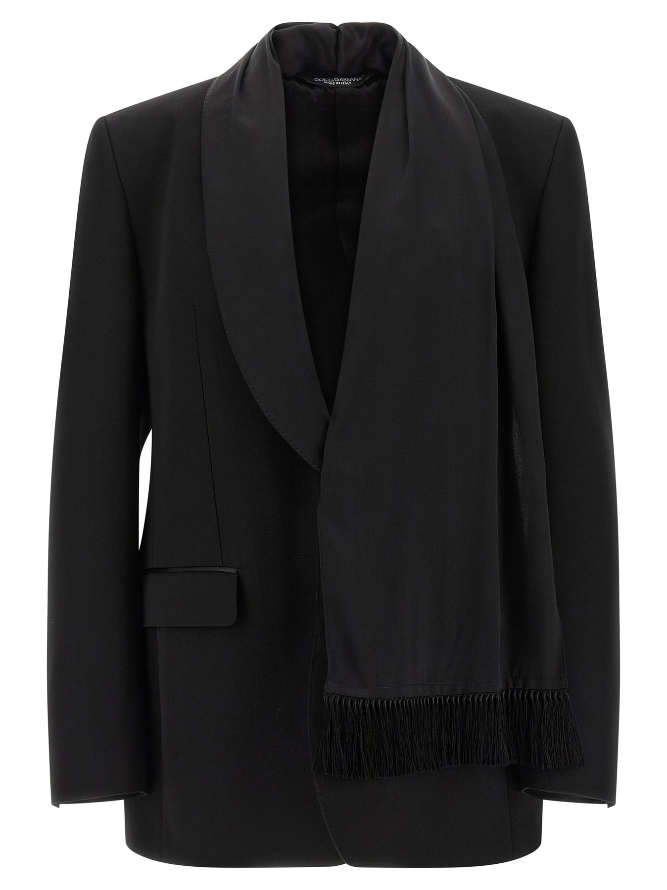 Single-breasted wool gabardine blazer with front button closure, shawl silk collar with scarf on the left side, pocket, flap pockets, structured shoulder strap, cuffs with open buttonholes, silk lining with inside pockets, back split.