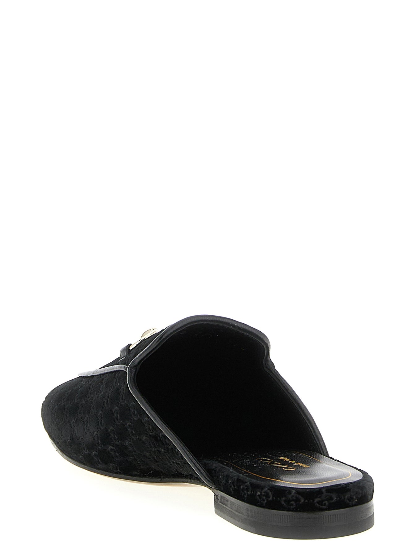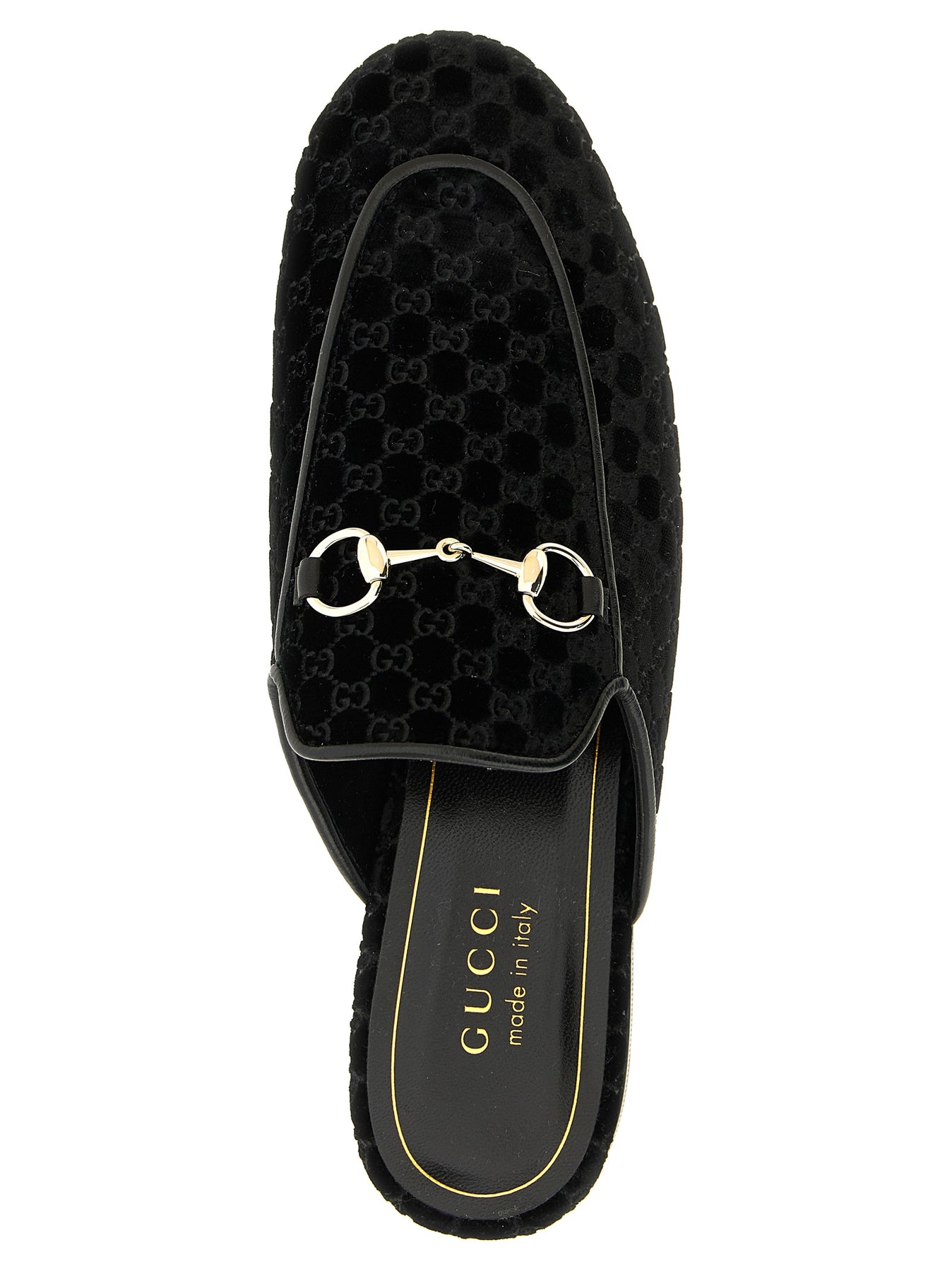 GG velvet 'Princetown' slippers with front metal clamp detail, rounded toe, leather sole.
