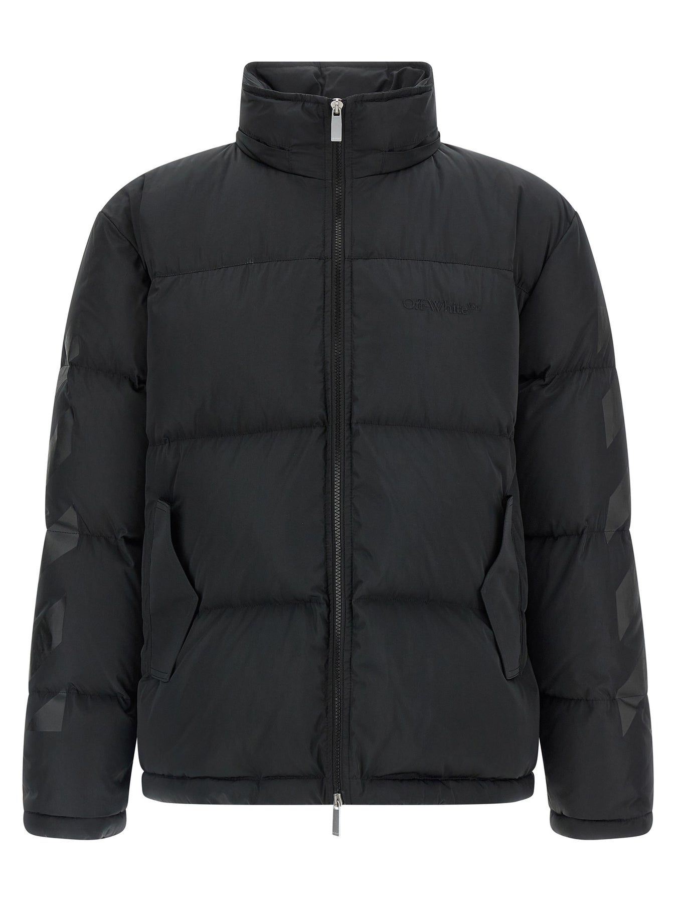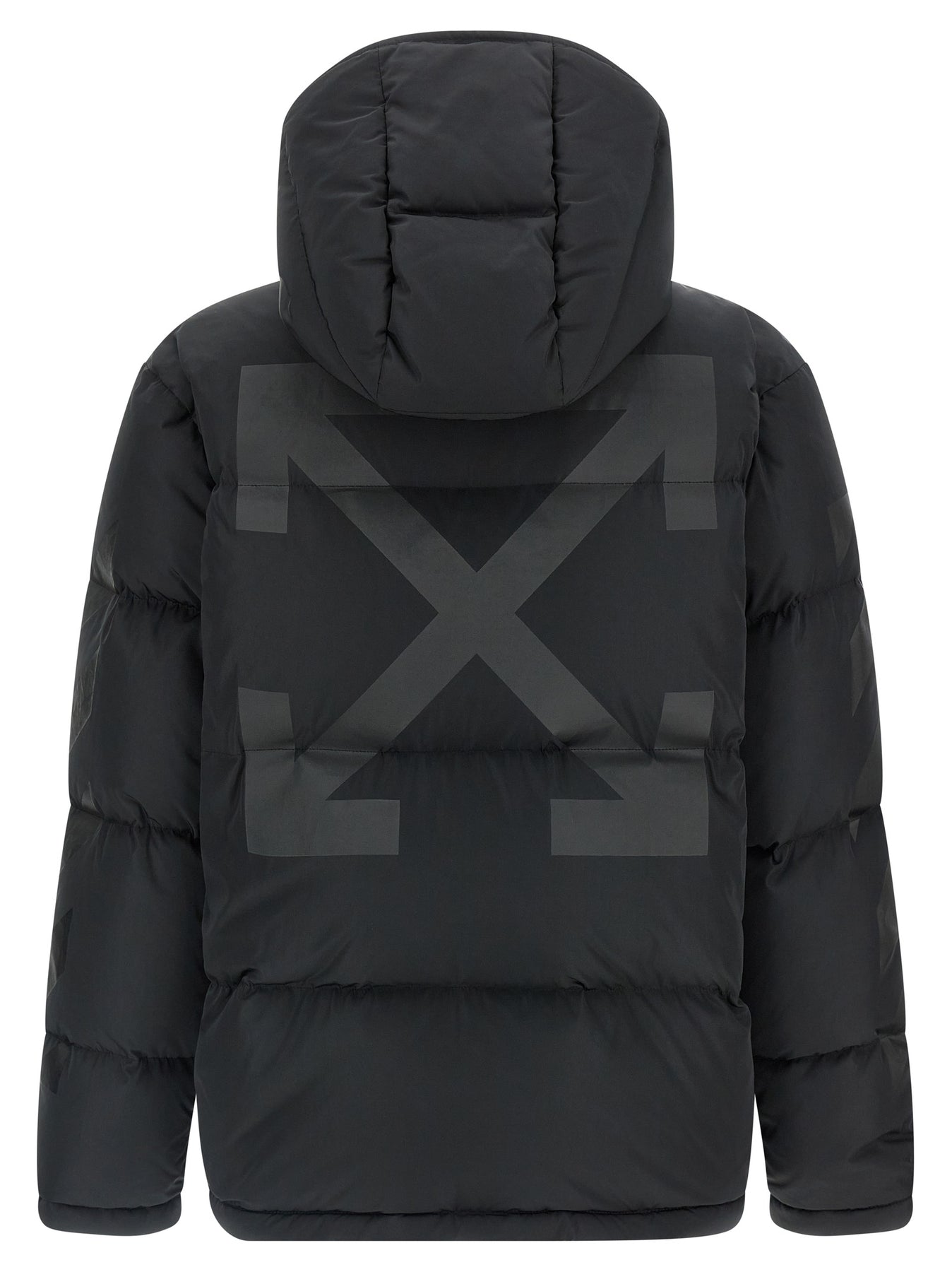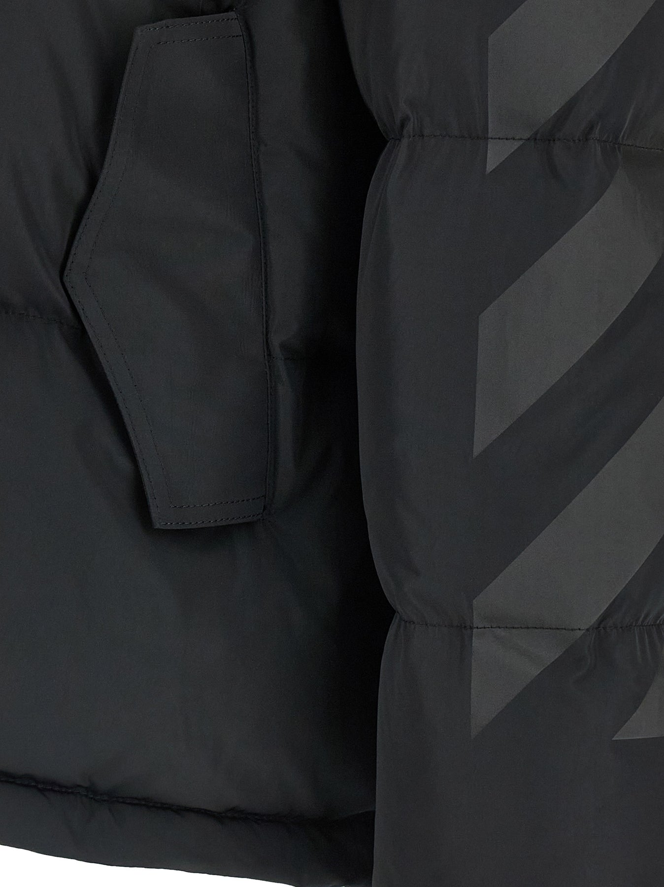 'Diagonal Arrow' quilted nylon down jacket with goose down padding, tone-on-tone logo print, removable hood, high neck, front zip closure, pockets, long sleeves with elastic cuffs, drawstring at the hem.