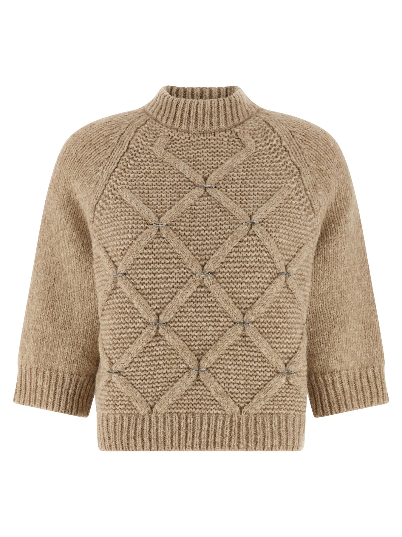 Alpaca and virgin wool blend knitted sweater with diamonds and front jewel details, crew neck, 3/4 cuffed sleeves.
