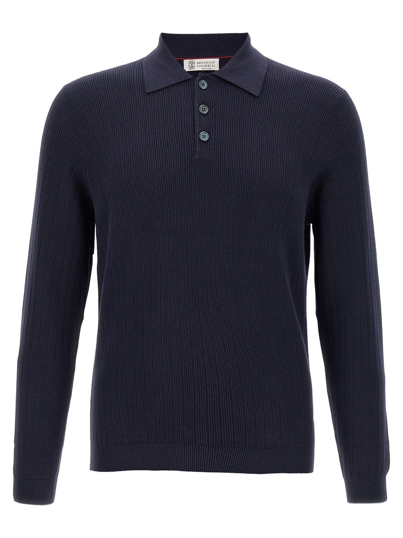 Crochet cotton polo shirt, collar and buttons, long cuffed sleeves.