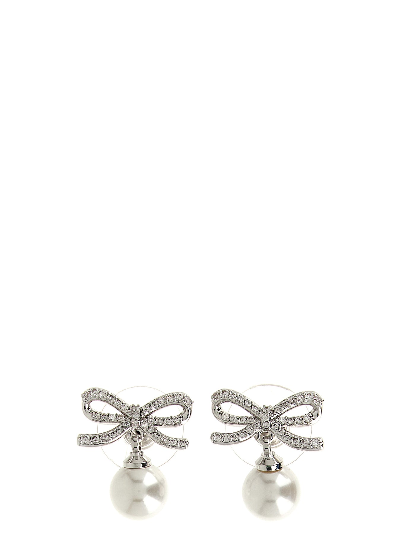'Bow Pearl' earrings in metal and crystals, bow-shaped model with pearl pendant, button closure. ITEM CANNOT BE RETURNED