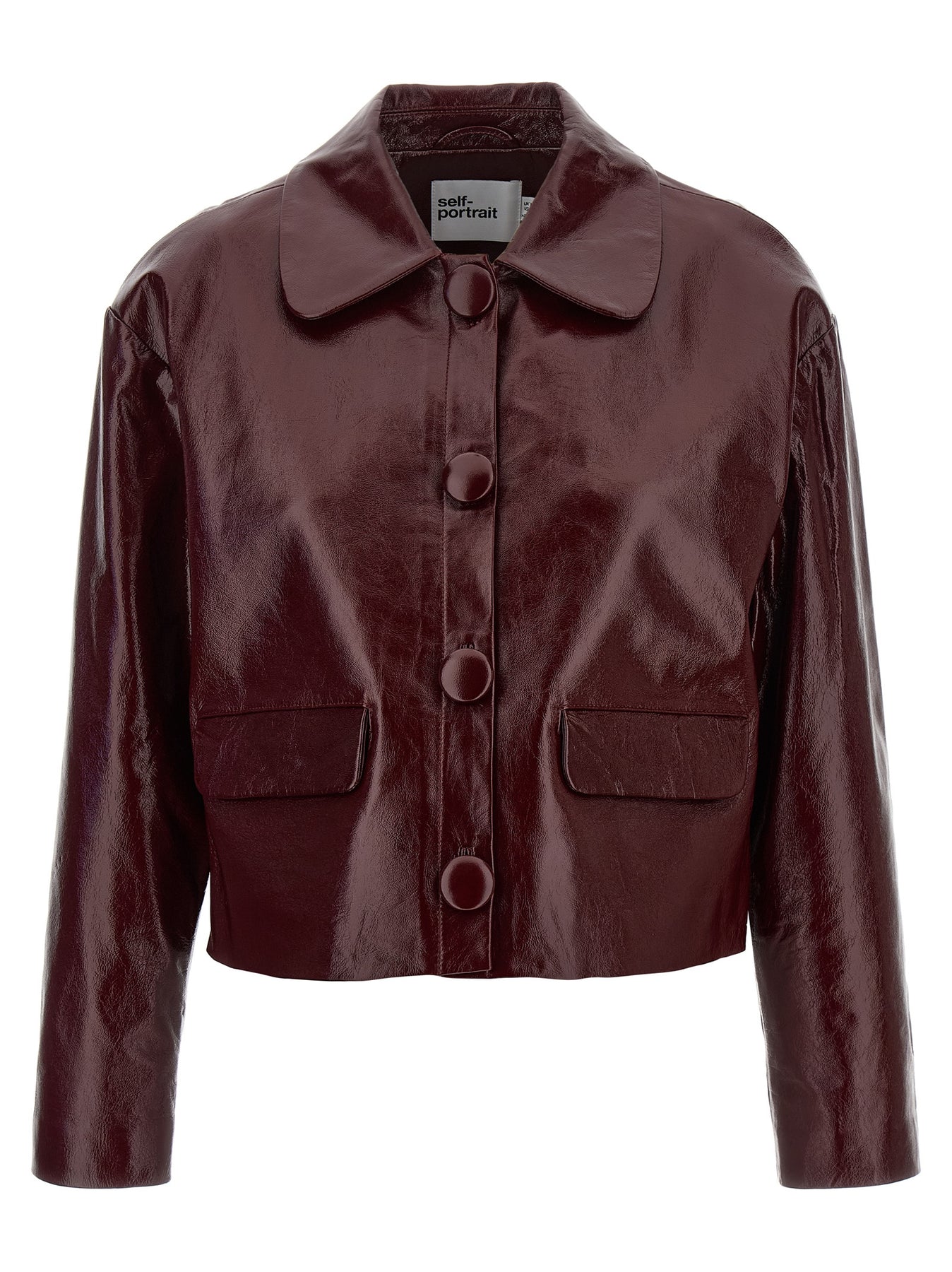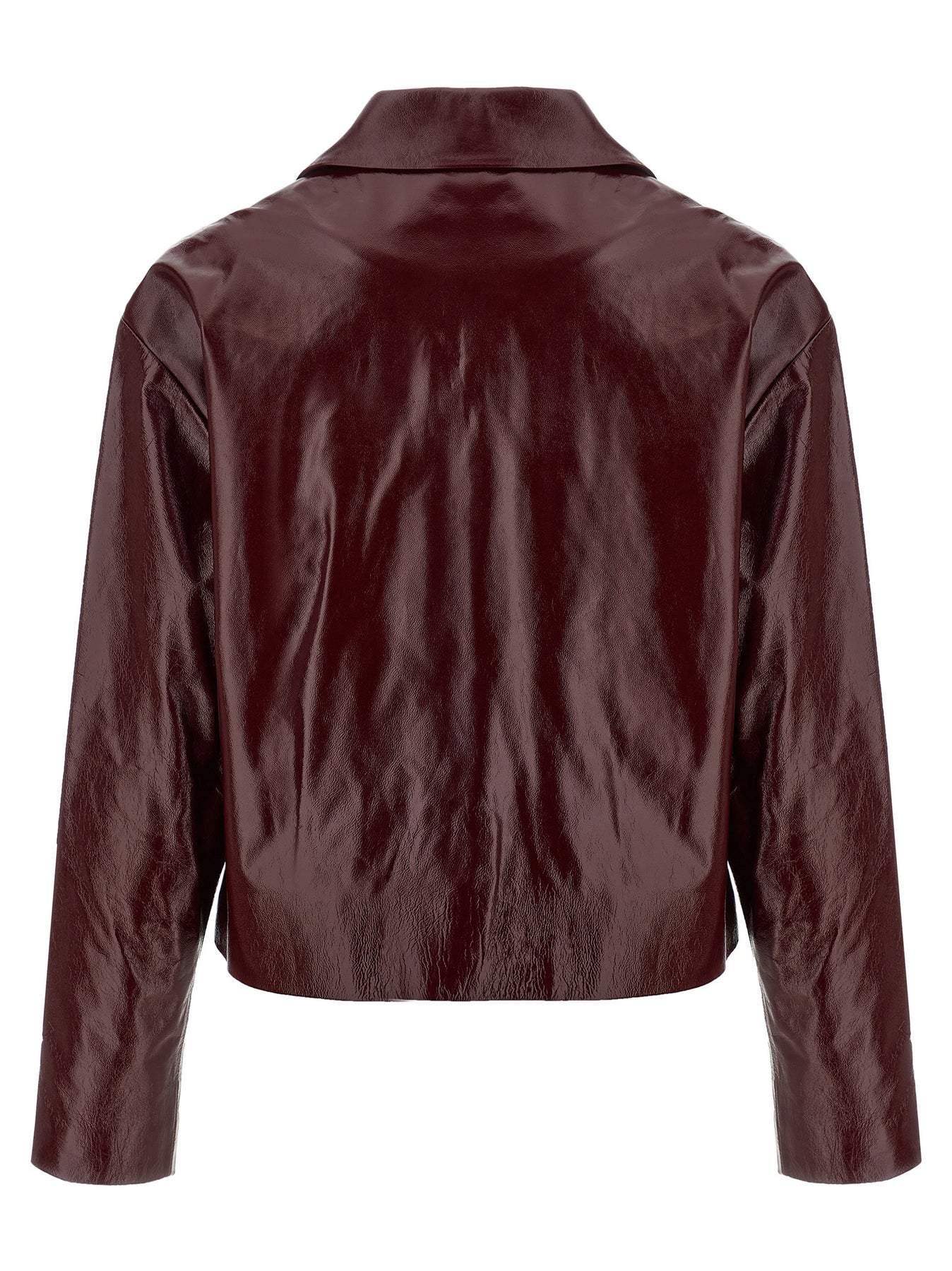 Crop jacket in craqué shiny leather with shirt collar, front button closure, flap pockets, long sleeves with dropped shoulders.