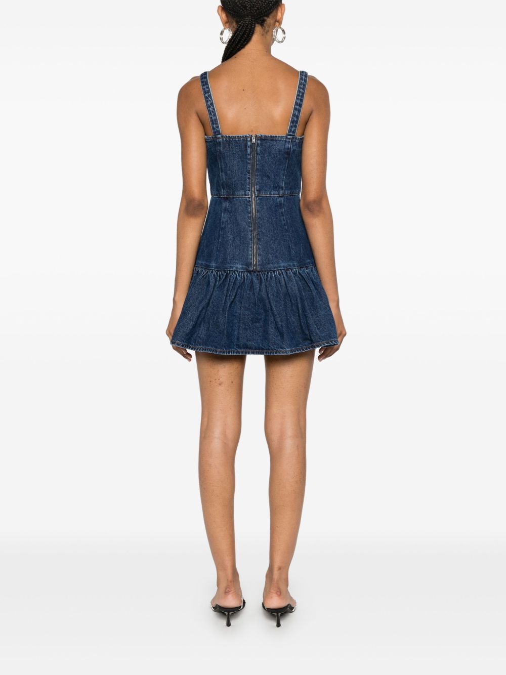 indigo blue cotton washed denim square neck thin shoulder straps bow detailing with crystal embellishment flared hem concealed rear zip fastening