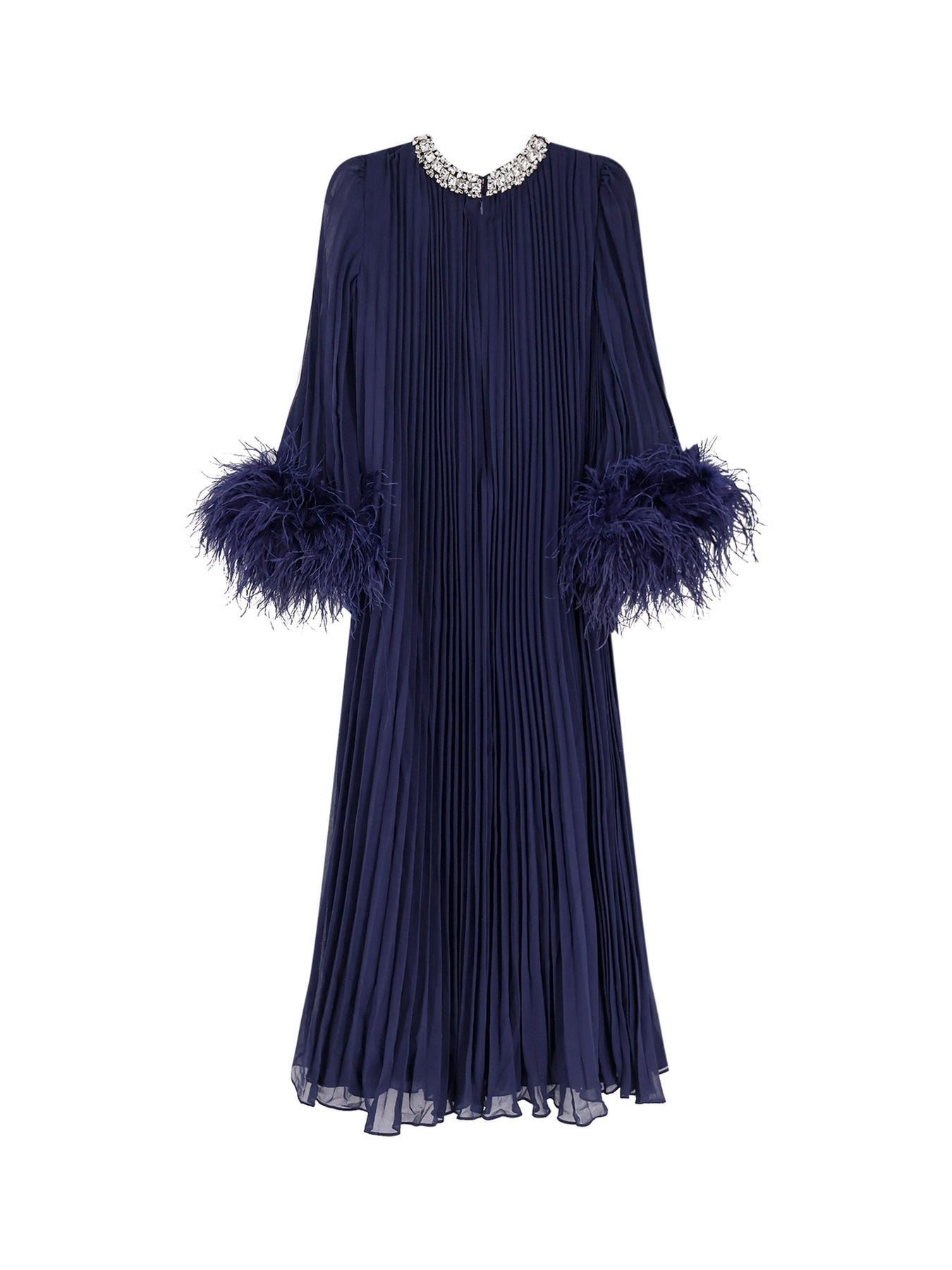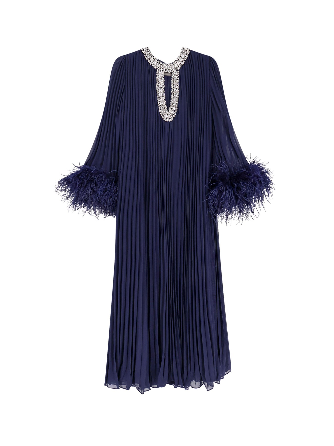Crew neck Edging with large rhinestones Cut-out detail Pleated Long sleeves with ostrich feathers Lined 100% polyester Lining: 100% polyester SKU: RS26510MNNAVY