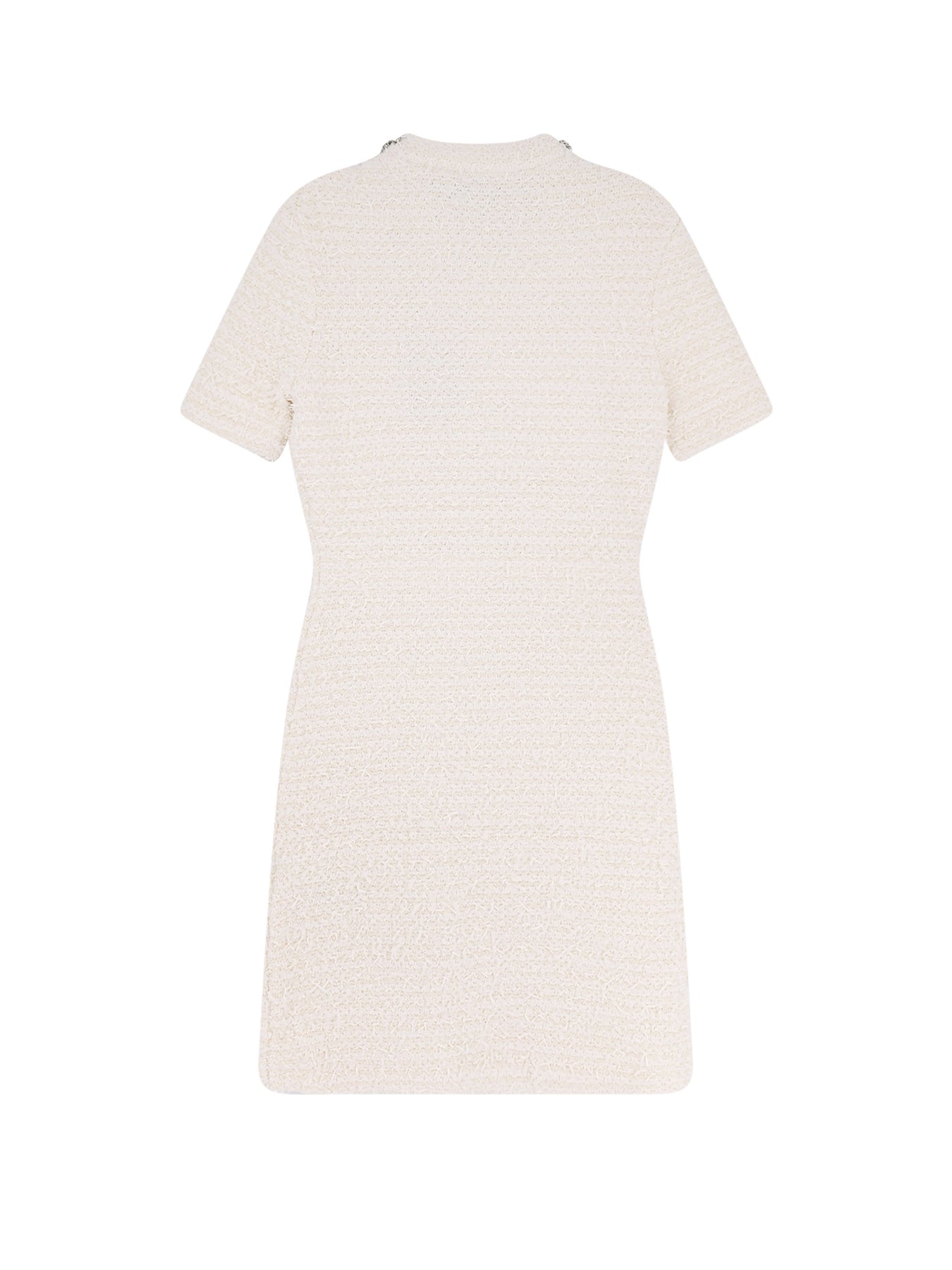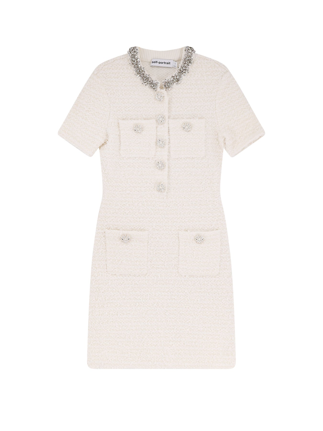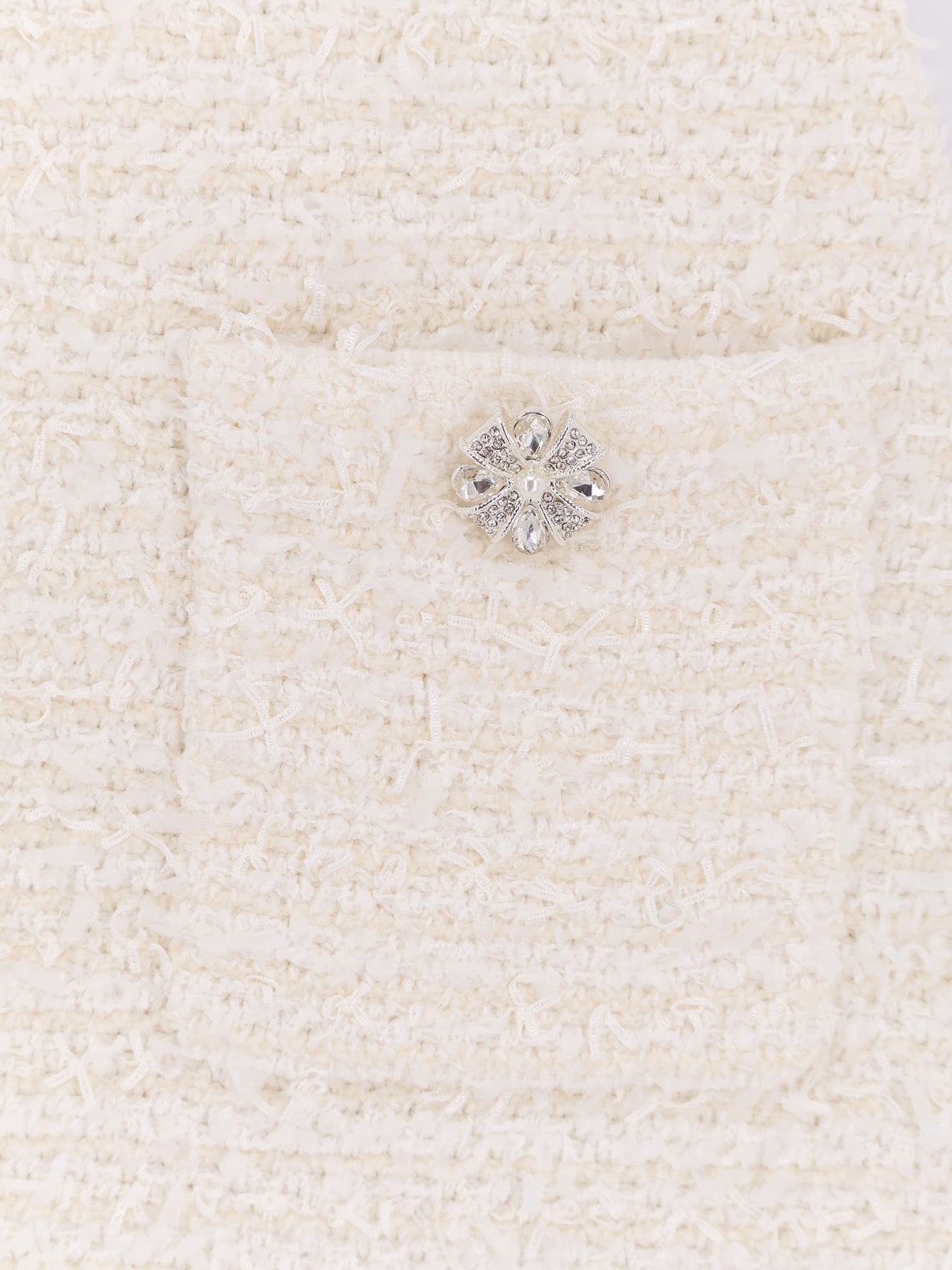 Crew neck with rhinestone trim Jeweled button closure Short sleeves Four front pockets 41% cotton, 30% polyester, 15% polyamide, 13% wool, 1% elastane SKU: AW25028SCCREAM