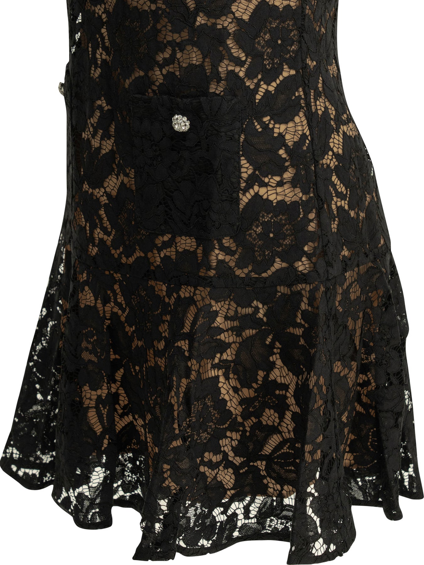 Self-portrait embroidered short dress with fitted construction and mini length. The guipure construction complements a swing silhouette inspired by the 1960s, featuring a low waist and rhinestone piping applied along the neckline. The inner lining is removable, while the main fabric offers minimal stretch. Closure is by a concealed zipper positioned at the back of the garment. || - Embroidered - Swing silhouette inspired by the 1960s - Applied rhinestone piping - Hidden zipper closure on the back - Removable inner lining - Low waist - Slim fit
