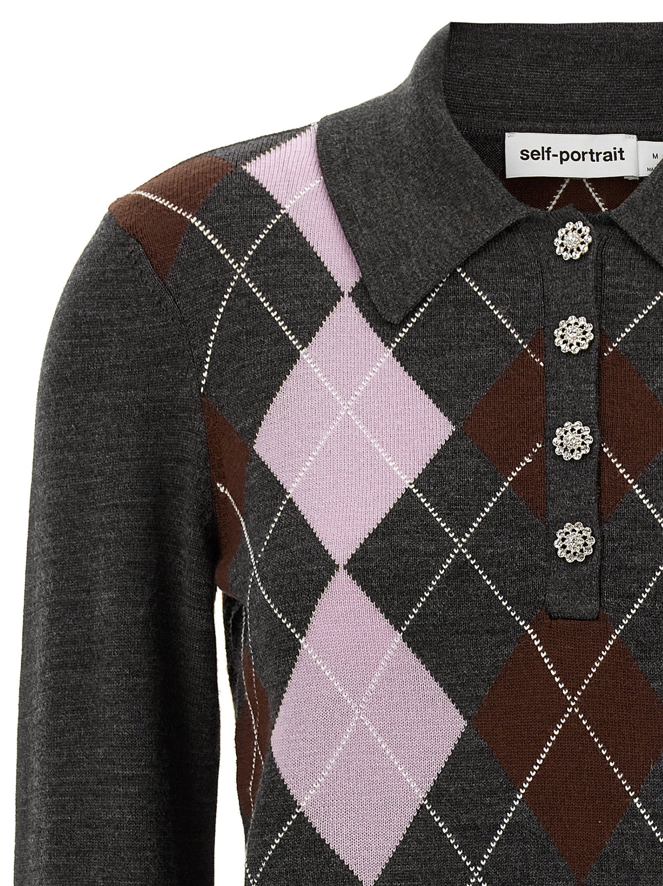 Grey Argyle Lightweight' Argyle wool sweater with embroideries on the front and back, polo shirt style with jewel collar and buttons, long cuffed sleeves.