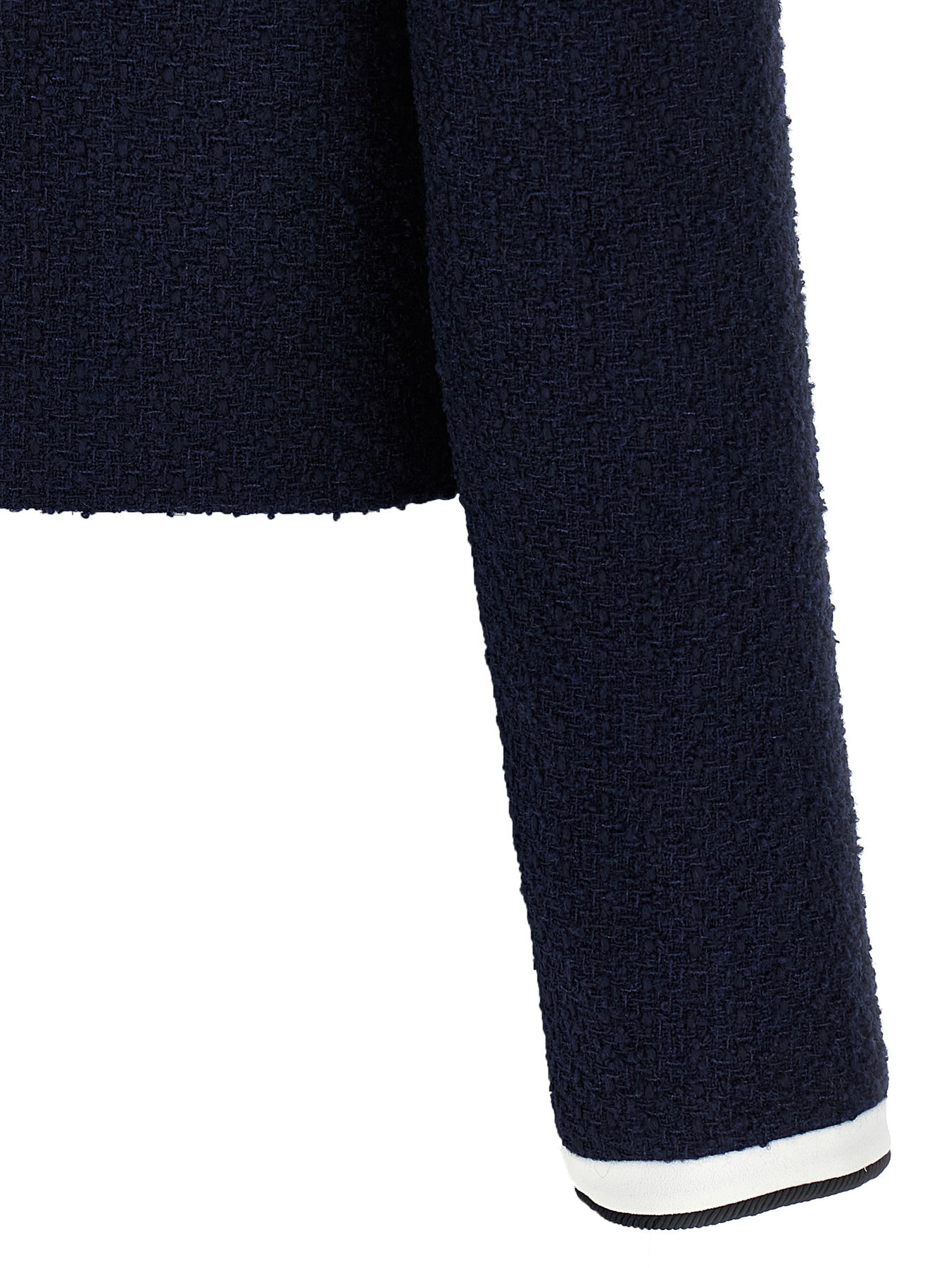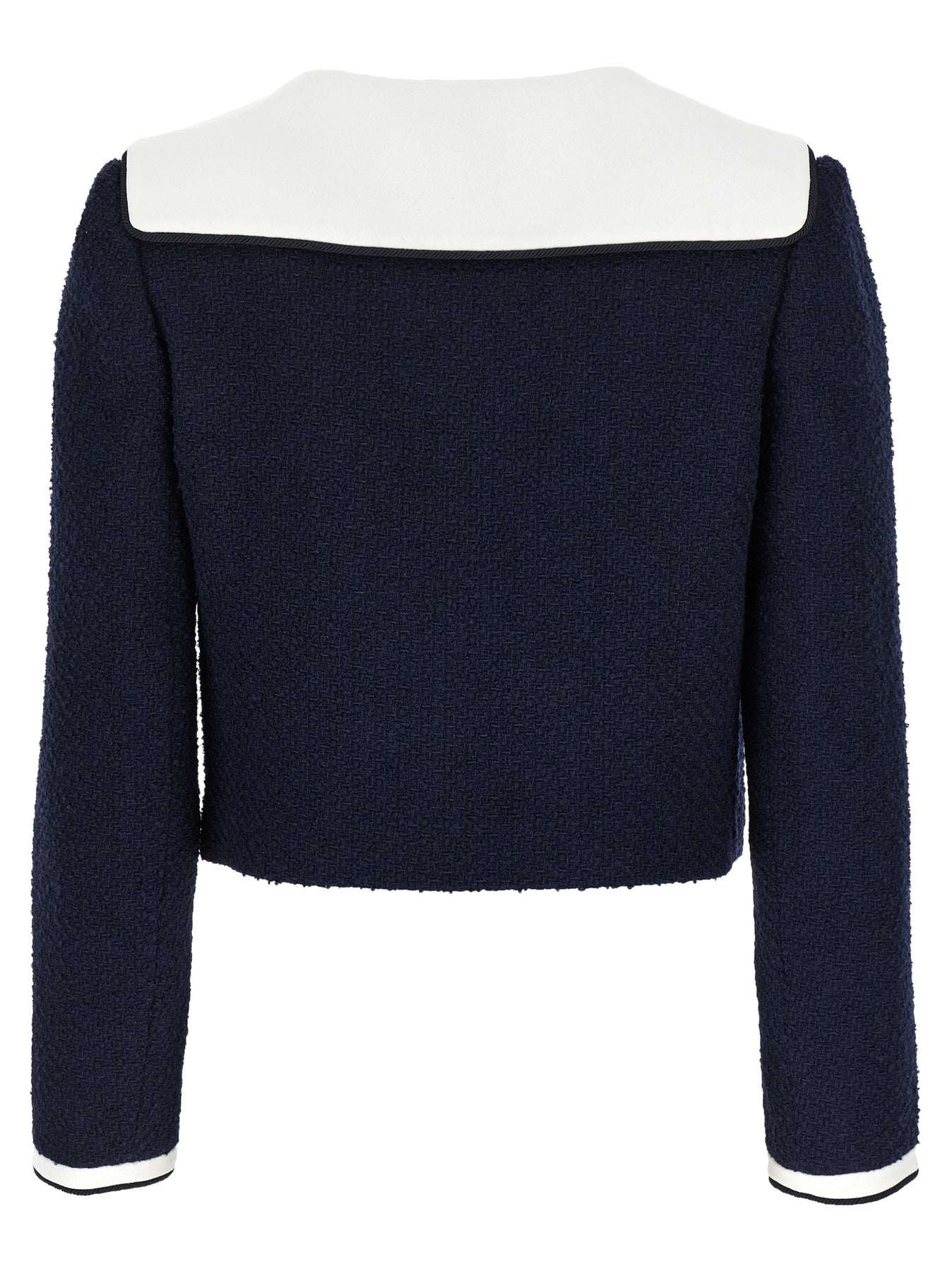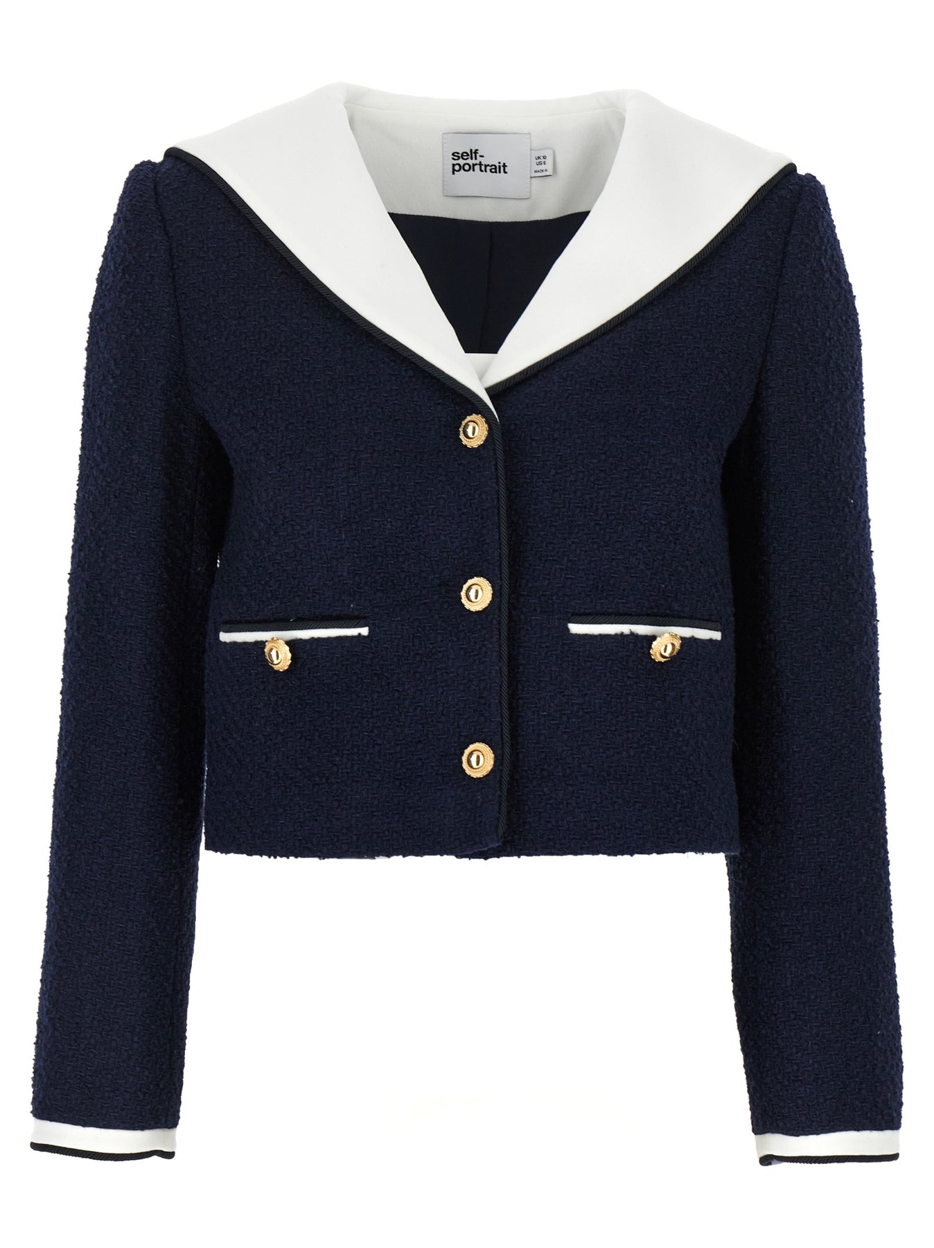 'Navy Boucle Contrast Collar' cropped bouclé blazer with contrast oversized sailor collar, V-neck, front button closure, pockets, long cuffed sleeves, structured shoulder strap, lining.