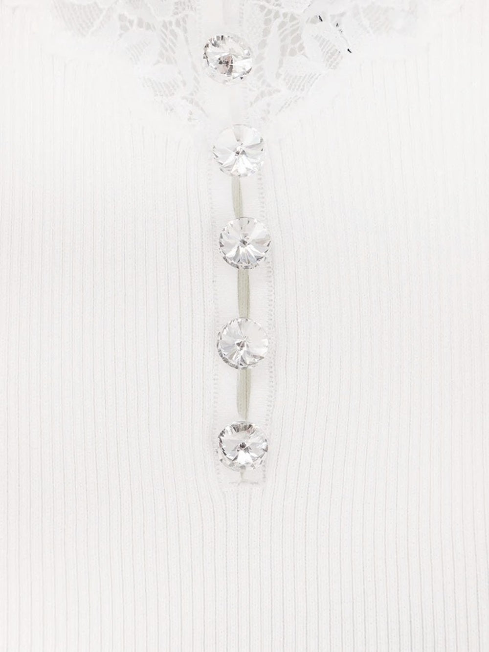 Viscose top with lace inserts Adjustable thin straps Crystal buttons on the front V-neckline with lace inserts Ribbed knit 62% viscose 38% polyester ID PF25042TW