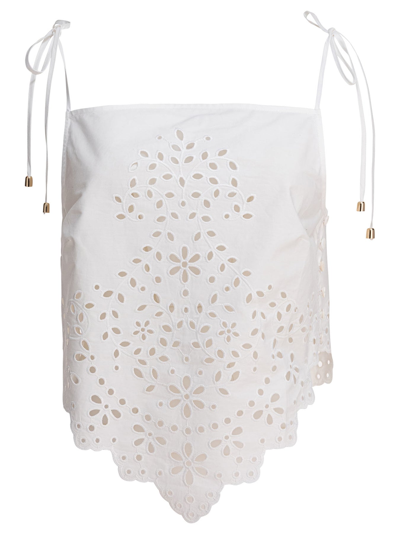 Self-Portrait embroidered cotton top, constructed of light-textured pure cotton fabric. It features a flared silhouette with hand-tied thin straps. The garment is unlined, with a full-length embroidered finish and scalloped hem. True-to-size construction maintains a comfortable fit for relaxed wearability without structural stiffness. || - Embroidered - Flared - Sleeveless - Scalloped hemline - Adjustable knotted straps - Unlined style - Regular fit