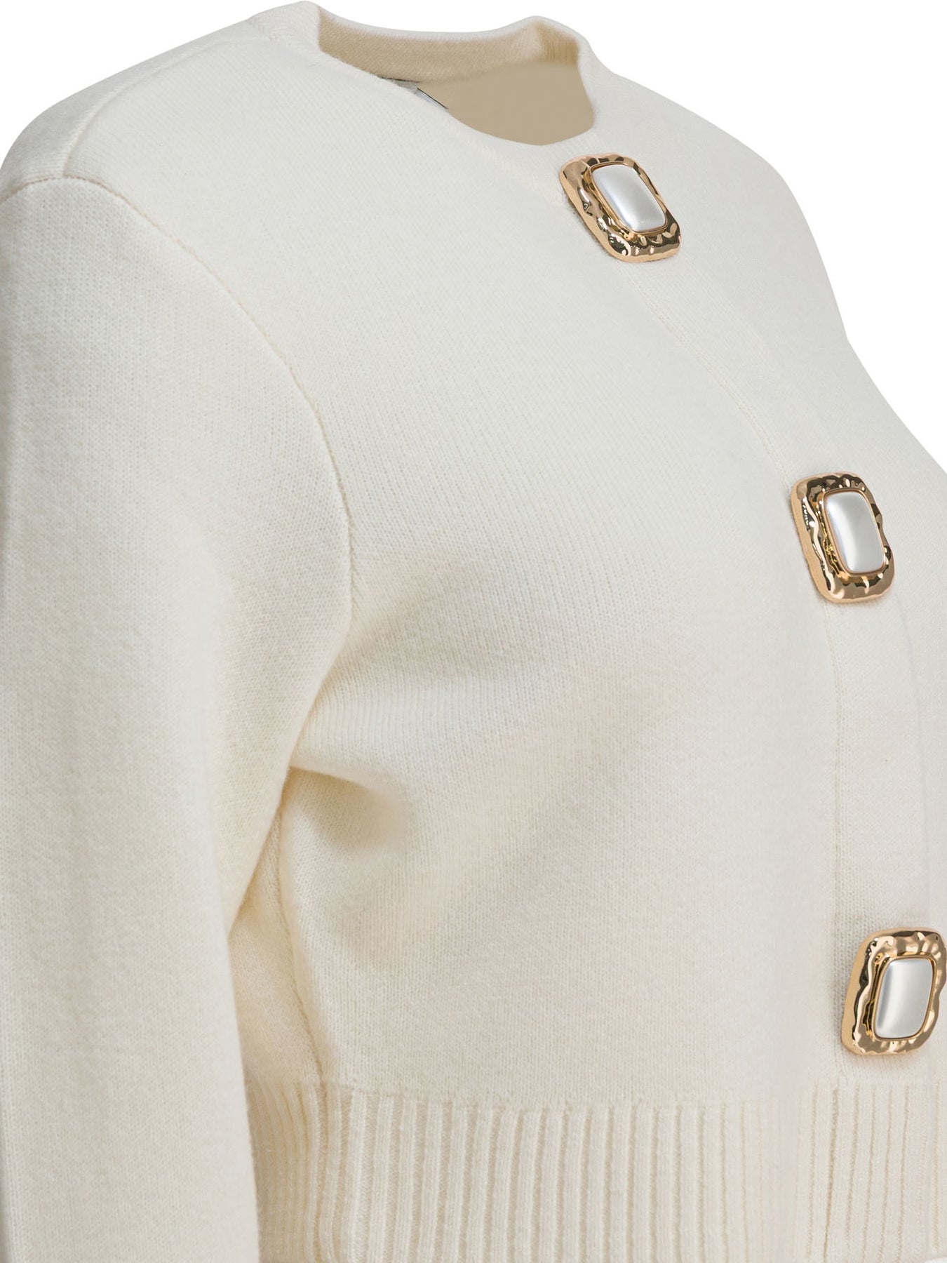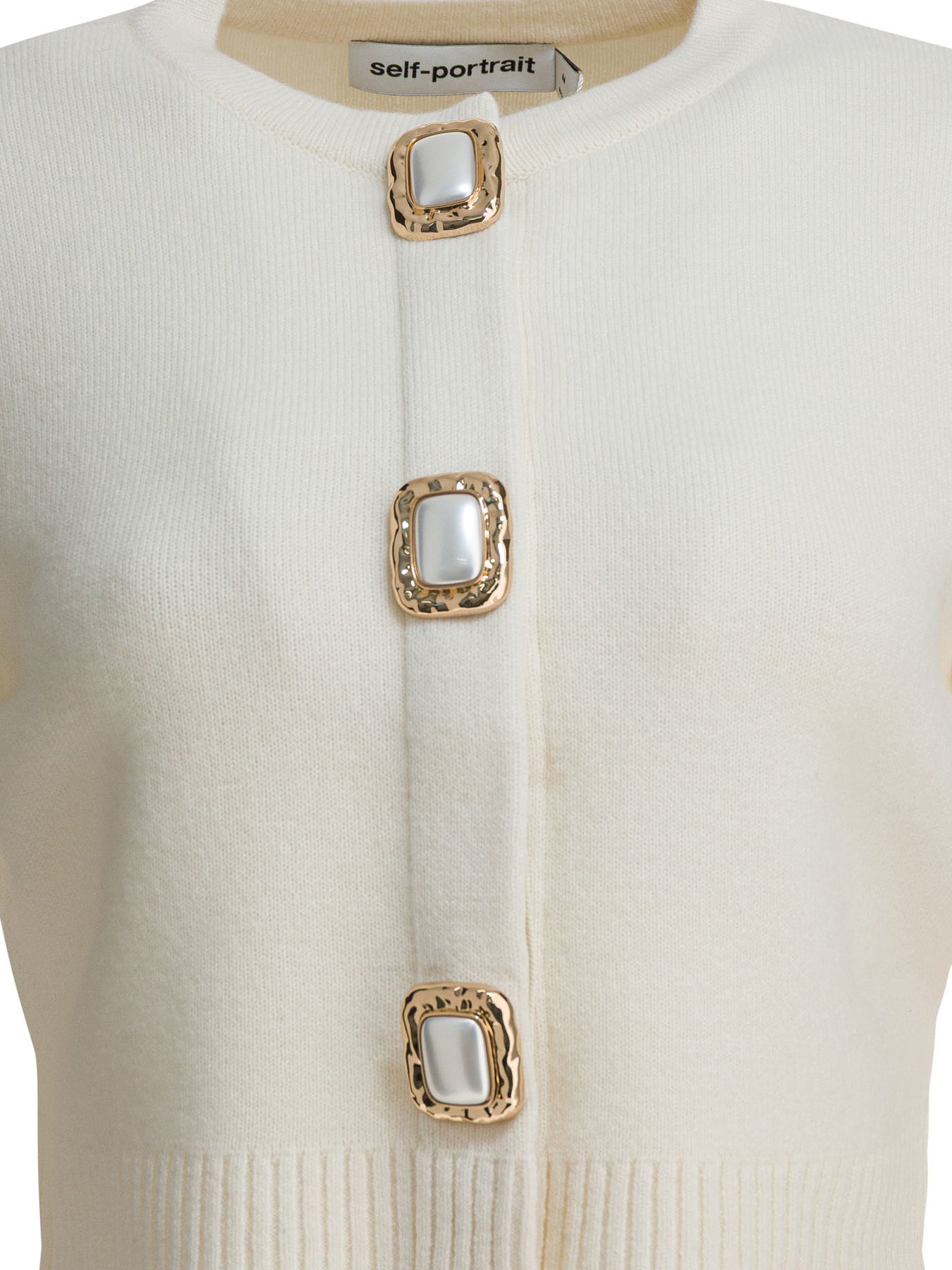 Self-portrait wool cropped cardigan made of compact stretch-textured knit, featuring a short silhouette and long-sleeved construction. The design features ribbed trim on the neckline, cuffs and bottom, with front closure concealed by a row of decorative buttons. The composition features a predominance of wool combined with minimal percentages of polyamide and elastane to ensure flexibility and dimensional stability. Relaxed fit without structural stiffening. || - Embellished with decorative buttons - Long sleeves - Ribbed trim on neckline, cuffs and hem - Front closure with concealed buttons and surface decoration - Stretch fabric - Cropped fit