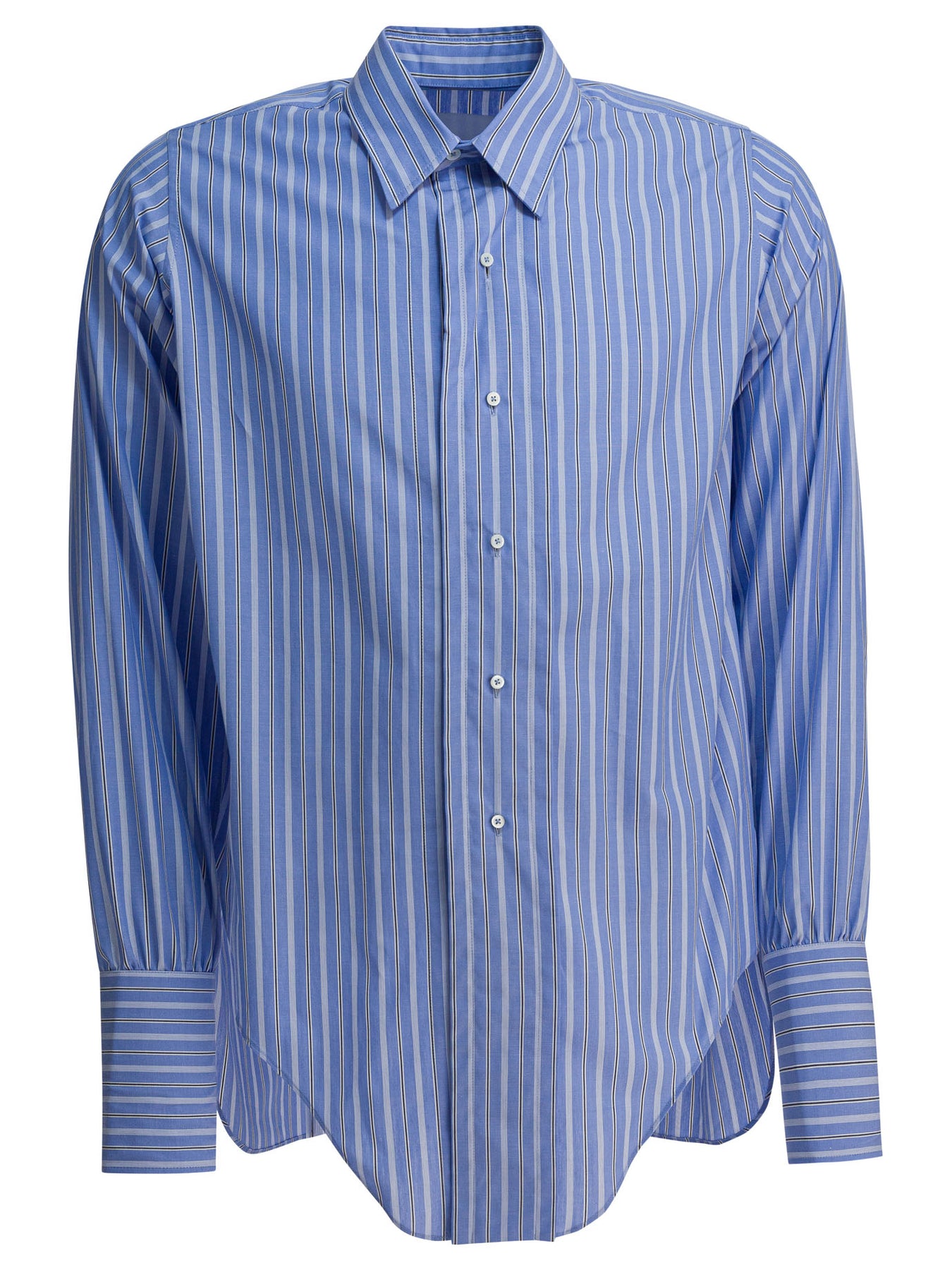 Maison Margiela cotton striped shirt made of cotton fabric with long sleeves and structured construction. Features pointed collar, front button closure and oversized button-adjustable cuffs. The front hem is curved and pointed, while the back hem stays straight. On the back are the four stitches, a distinctive element of the Maison that characterizes the garment in a recognizable way. || - Striped - Long sleeves - Pointed collar - Front button closure - Oversized cuffs with button closure - Curved, pointed front hem - Straight back hem - Regular fit