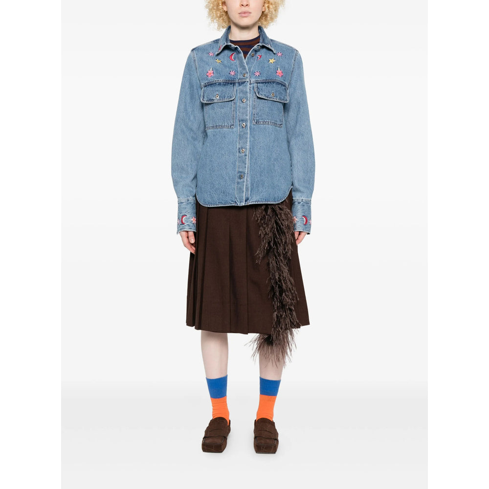 blue embroidered flowers button fastening long sleeves polo collar curved hem