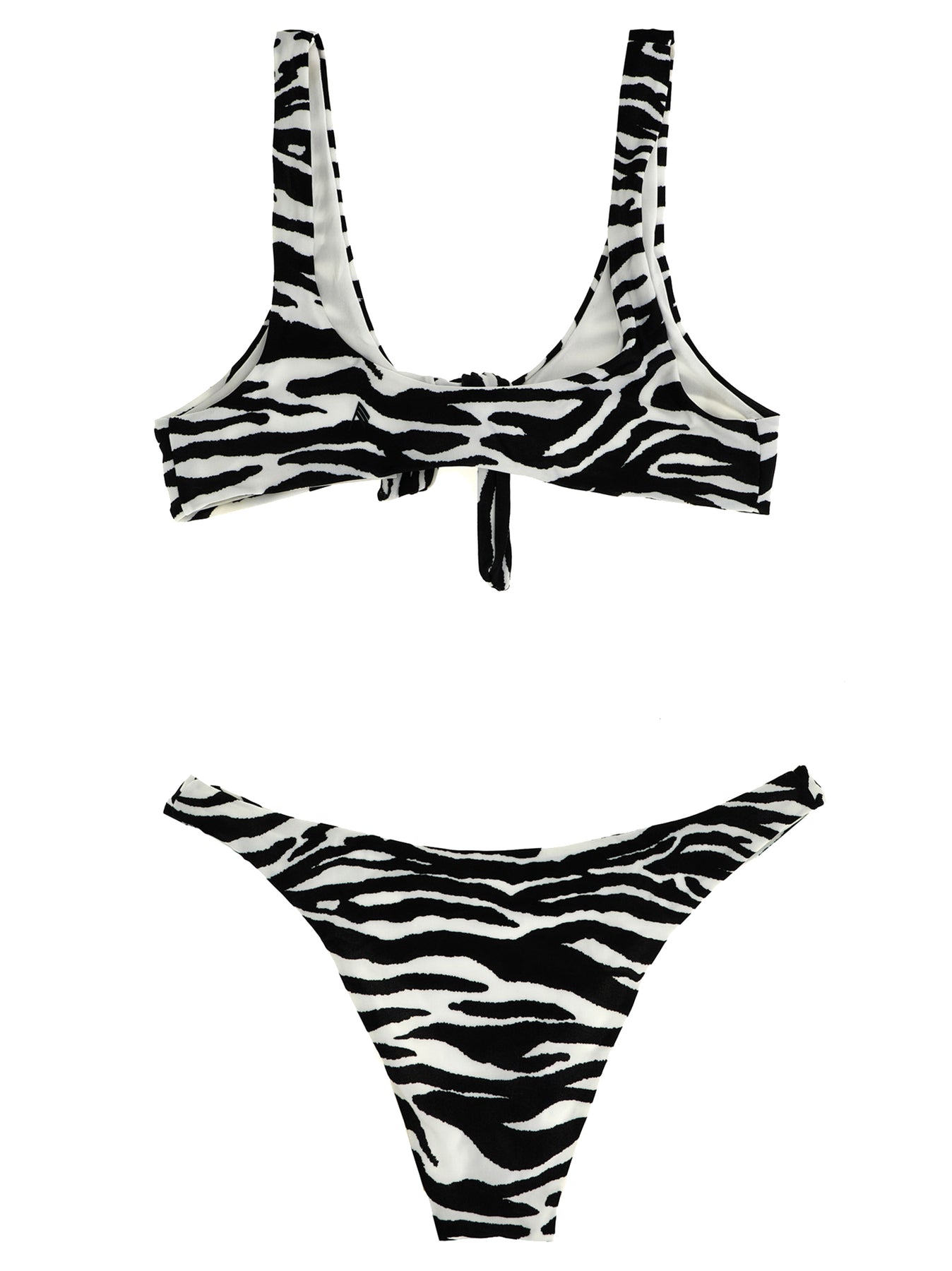 'Estate Meravigliosa' all-over animalier print lycra bikini, triangle top with front knot, and high-cut bottoms.