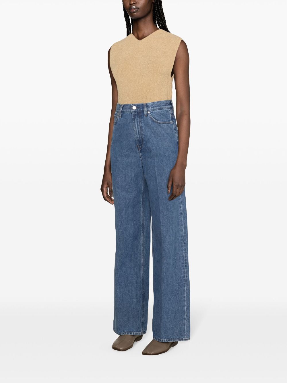 Indigo blue, cotton, washed denim, logo patch on the back, high waisted, belt loops, button with engraved logo, front button and zip closure, classic five pockets, wide leg.